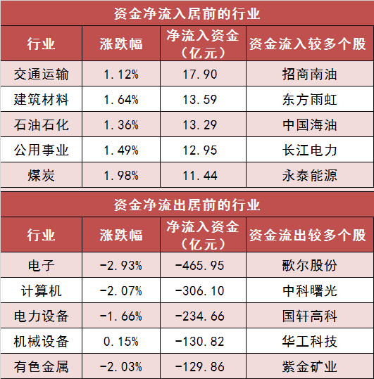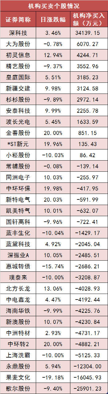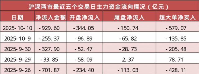 盘后数据出炉。 10月10日,A股市场整体下跌。截至收盘,上证指数报3897.03点,下跌0.94%;深证成指报13355.42点,下跌2.7%;创业板指报3113.26点,下跌4.55%。两市合计成交25156.14亿元,较上一交易日减少1375.83亿元。 1. 两市主力资金净流出近930亿元 今日沪深两市主力资金开盘净流出344.05亿元,尾盘净流出150.74亿元,两市全天主力资金净流出929.6亿元。 2. 沪深300主力资金净流出近400亿元 沪深300今日主力资金净流出396亿元,创业板净流出415.71亿元。 3.交通运输等行业实现净流入 4. 主力资金净流入居前20股 5. 机构龙虎榜 6.机构最新关注个股 校对:杨舒欣 |