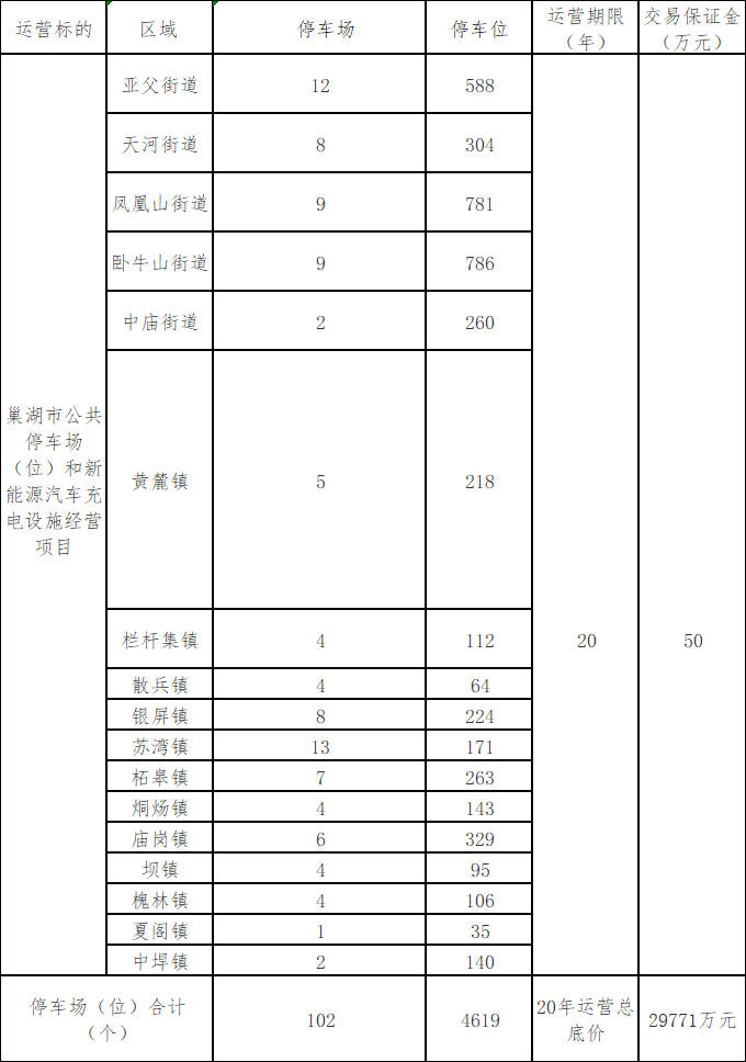 北极星储能网获悉,10月1日,安徽合肥巢湖市公共停车场(位)和新能源汽车充电经营招标,该项目覆盖102个停车场、4619停车位,20年运营总底价29771万元。 原文如下: 巢湖市公共停车场(位)和新能源汽车充电设施经营项目公告 1. 项目名称 巢湖市公共停车场(位)和新能源汽车充电设施经营项目 2. 项目编号 2025AMMCJ00077 3. 委托方 巢湖市工业和信息化局 4. 委托方承诺 委托方承诺本次运营行为已履行了必要的审批程序,保证本公告的内容不存在任何重大遗漏、虚假陈述或严重误导,并对其内容的真实性、完整性和准确性负责。 5. 公告及竞价期限 公告期:2025年10月1日9:00始至2025年10月30日17:00止。 网络连续竞价自由报价期:2025年10月1日09:00始至2025年10月31日10:00止,自由报价期满进入延时竞价期,延时竞价周期为180秒。 标的坐落位置: 巢湖市区及所属乡镇停车场 (位) 标的权属情况:运营标的无权属纠纷,委托方将提供该处标的的权属证明和运营证明,方便受让方办理相关证照。其他有关瑕疵须由意向受让方现场踏勘并向委托方了解。 标的其他情况说明: 运营用途要求:本项目运营标的用途公共停车场(位)和新能源汽车充电设施经营。成交人运营标的必须符合相关法律法规要求,如由此造成成交人不能按预想的方案开展经营活动并导致运营合同不能履约的,责任由成交人承担。 运营费用及履约保证金支付:经营权转让费由中标经营权受让者在签订《经营权转让协议》后6个月内一次性缴纳全部转让价款。具体起止日期于项目成交后双方在合同中约定。履约担保费用为成交后首年 3个月运营费用之和(现金、纸质保函均可),履约担保在合同签订生效前提交。 二、经营条件 (一)经营期间项目应遵循的标准和质量规范具体要求如下: 1.遵循的标准和质量规范 (1)项目地点的水文、气象、地质、用地范围等有关资料; (2)当地城市规划、环境保护、市政工程、绿化等有关要求; (3)当地风土人情有关情况; (4)建筑、水、电、暖通等专业提供的设计资料及要求。 2.应当遵守的规定 (1)经营权受让者进行公共停车场停车位运营以及管理活动必须严格执行《合肥市机动车停车场管理办法》《合肥市城市管理条例》《中华人民共和国城乡规划法》《中华人民共和国道路交通安全法》《城市道路路内泊车位设置规范》(GA/T850-2021)、《城市公共停车场工程项目建设标准》(建标128-2010)、《城市停车规划规范》(GB/T51149-2016)、《城市停车设施建设指南》等国家相关法律法规、规范和行业的强制性技术标准。提供优质、持续、高效、安全的服务,同时加强运行管理,建立完善的质量保证体系、安全生产管理体系和应急服务机制,确保服务品质和服务质量。 (2)充电基础设施及配套电网建设应当严格执行《电动汽车充换电设施建设技术导则》(NB/T33009)、《电动汽车充换电设施供电系统技术规范》(NB/T33018)等标准的规定。充电站建设还应当严格执行《电动汽车充电站设计规范》(GB50966)、《电动汽车充电站通用要求》(GB/T29781)、《电动汽车电池更换站设计规范》(GB/T51077)等标准的规定。充电站应当按照《电动汽车充电站及电池更换站监控系统技术规范》(NB/T33005)、《电动汽车充电站电池更换站监控系统与充换电设备通信协议》(NB/T33007)等标准的规定建立站级监控系统,保证充电站、换电站安全稳定运行。 (3)在经营期内进行停车位收费的价格标准应符合基本市场行情,由实施机构负责公共停车场及充电设施工作的相关部门审批后执行。 (二)经营权受让者自行负责本项目全部投资、运营、管理和维护(包括更新),自行承担相关费用、责任和风险。 (三)在运营期内,经营权受让者必须遵守国家和省、市、县政府的各项法规政策,依法经营,认真履行运营管理责任。项目期限内未经政府方同意,经营权受让者不得擅自决定中断项目设施的运营和维护、解散、歇业。 (四)非经政府方同意,经营权受让者不得将项目资产转让给第三方。 (五)经营权受让者应从有关政府部门获得、保持和延续本项目所必需的应由经营权受让者办理的许可、执照和批准,相关费用由经营权受让者支付。 (六)项目协议期内,经营权受让者应按适用法律和谨慎运营原则,购买和维持本项目有关的保险。 (七)经营权受让者应在合作期间向政府方或其授权部门提交可以支付的现金或不可撤销的纸质保函。 (八)经营权受让者应接受政府方依照适用法律进行的临时接管和其他管制措施。 (九)项目运营过程的重大问题应及时向政府方及有关部门汇报。 (十)经营权受让者应当保证本项目及其设施符合消防、卫生、安全、环保等要求,配备安全保护设施和人员,确保设施安全正常使用;应当完善安全管理制度,健全应急救护措施和突发公共事件预防预警及应急处置预案,定期开展安全检查、培训和演练。 (十一)经营权受让者应接受政府方和相关政府部门根据适用法律和本协议的规定对项目运营和维护进行的监督和检查,并提供相应的工作条件,并应根据本协议以及政府方和相关政府部门的要求,及时向其报送有关资料;经营权受让者应配合政府方委托的第三方机构对其 进行监督考核。 (十二)经营权受让者按照本项目协议规定的内容提供停车服务,并服从政府方对于停车位管理要求,达到《经营权转让协议》约定的停车位管理服务质量标准。