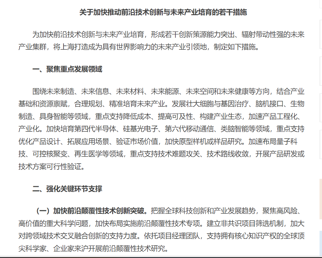 上海大力培育未来产业! 10月11日,上海召开市政府新闻发布会,介绍出台的《关于加快推动前沿技术创新与未来产业培育的若干措施》(以下简称《若干措施》)。证券时报记者从发布会现场获悉,上海力争到2027年,突破一批前沿颠覆性技术,体系化布局建设一批未来产业集聚区,培育20家左右未来产业生态主导型企业。到2030年,培育壮大一批未来产业,推动形成若干战略性新兴产业,成为具有世界影响力的未来产业引领地。 根据当天发布的《若干措施》,上海将发展壮大细胞与基因治疗、脑机接口、生物制造、具身智能等领域;加快培育第四代半导体、硅基光电子、第六代移动通信(6G)、类脑智能等领域;加速布局量子科技、可控核聚变、再生医学等领域。 制定差异化、针对性培育方案 “未来产业”是指处于孕育萌发阶段或产业化初期,具有显著颠覆性、前瞻性的新兴产业。培育未来产业,是引领科技创新、重塑产业格局的战略支点。 在发布会上,上海市科委副主任屈炜透露,上海将围绕未来制造、未来信息、未来材料、未来能源、未来空间、未来健康六大方向,分近、中、远三个层次,合理规划、分层推进、精准培育。 具体来看,发展壮大细胞与基因治疗、脑机接口、生物制造、具身智能等领域,重点支持降低成本、提高可及性、构建产业生态;加快培育硅光、6G、第四代半导体、类脑智能等领域,重点支持优化产品设计、拓展应用场景、验证市场价值;加速布局量子科技、可控核聚变、再生医学等前沿领域,重点支持技术难题攻关、技术路线收敛、产品可行性验证。 记者注意到,《若干措施》从强化关键环节支撑、激发企业创新活力和打造产业集群高地等六方面推出15条措施,加大未来产业培育。其中,对符合条件的创新产品按照规定给予不超过合同金额30%、最高2000万元支持;对符合条件的场景建设任务按照规定给予最高800万元支持。 司南半导体孵化器致力于构建第四代半导体未来产业从“概念验证-孵化加速-产业聚集”的体系化布局及完整产业协同生态建设。司南半导体孵化器总经理李四华接受证券时报记者采访时表示,第四代半导体技术在新能源汽车、6G通信、大功率电力电子等领域拥有巨大应用潜力,但目前尚未迈入产业化阶段,其技术成熟度与应用可行性仍需进一步培育与验证,如果能将开放一些前沿应用场景,将加速技术的迭代,对培育未来产业非常有帮助。 据屈炜透露,上海对布局的细胞与基因治疗、脑机接口、硅光、6G、类脑智能、量子计算、可控核聚变等一系列未来产业重点发展领域,逐一制定差异化、针对性的培育方案。 上海市经济信息化委总工程师裘薇表示,上海围绕未来产业领域,储备培育一批产业创新平台。通过揭榜挂帅形式,启动生物制造、量子科技、6G等9个领域35个未来产业试验场建设,加速新产品验证和迭代;支持人形机器人、新型储能等领域第一批示范性市级中试平台建设,加快未来产业新技术向现实生产力转化。 此前,上海已相继发布实施了脑机接口、量子计算、硅光、6G等多个领域的未来产业培育方案,启动建设超宽禁带半导体、基因编辑等一批概念验证平台,同步布局了12家高质量孵化器,并设立总规模约150亿元的未来产业基金。同时,打造“上海未来启点社区”,并启动建设了类脑智能、硅光、脑机接口等领域的未来产业集聚区。 谋划创建国家级未来产业先导区 《若干措施》提出,上海将打造未来产业集群高地,核心是以空间集聚推动产业集群发展。根据重点领域的产业潜力和规模,市、区合力谋划建设未来产业集聚区。对符合条件的未来产业集聚区建设主体,按照规定给予最高2000万元支持。 屈炜透露,上海目前已在浦东、闵行、杨浦、临港等启动建设了若干未来产业集聚区,谋划创建国家级未来产业先导区,制定专项政策支持,助力先导区高质量发展。 “集聚区”是承载未来产业发展的“核心空间载体”。上海通过市区联动、合力谋划建设集聚区,推动产业链上下游高效整合,力争实现:企业入驻即可就近对接合作伙伴、中试平台与应用场景,充分利用资源,加快形成集群优势。 上海浦东新区副区长李慧在发布会上透露,张江作为首批上海市未来产业先导区,已在模力社区、机器人谷、创博园等区域形成具身智能、硅光等未来产业集聚。下一步,浦东将以更开放的视野、更前瞻的布局、更务实的举措落实《若干措施》要求,争取到2030年形成若干个世界领先的未来产业集群。 上海脑机接口未来产业集聚区正在积极推进建设。上海新虹桥国际医学中心建设发展有限公司董事长顾耀强接受记者采访时表示,该集聚区由上海市科委牵头,闵行区、华山医院、临港集团和上海国投共同建设,坐落于新虹桥国际医学中心,“将以建设‘全球脑机接口技术创新策源地、产业融合示范高地和国际合作枢纽’为目标,构建‘一个核心区+一个生态圈+一张协同网’的发展格局,重点打造临床转化、概念验证和孵化加速核心功能,逐步形成国家级脑机接口未来产业发展共同体”。据透露,自2025年6月29日揭牌以来,该集聚区已取得一系列实质性进展,包括揭牌上海市脑机接口临床试验与转化重点实验室,重点布局两大方向:一是加速脑机系统的临床试验与产业化落地,二是以临床需求为导向,孵育颠覆性创新技术,承接国家重大任务。同