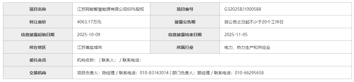 10月9日,国网综合能源服务集团有限公司转让江苏网能智慧能源有限公司60%股权,转让底价4063.17万元。 公开资料显示,江苏网能智慧能源有限公司经营范围包括智慧能源管理;综合能源服务;售电服务;光伏发电、风力发电、储能、氢能、清洁能源及相关设备和产品的技术研发、技术推广、技术服务;智慧城市、大数据中心、海上风电、海水淡化、节能改造项目的规划、建设、运营和维护;新能源、分布式能源、合同能源管理项目的开发、建设、运营、管理;输配电及控制设备、电动车充电设备、五金产品(除电动三轮车)、空调产品、蒸汽、热水(除生活用水)销售;燃气经营等。 据悉,该公司由国网综合能源服务集团有限公司(60%)、盐城市国能投资有限公司(40%)共同持股。 |