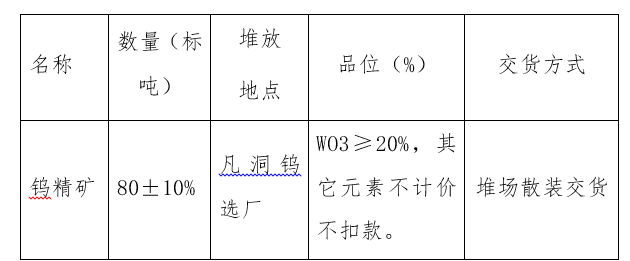 广东省大宝山矿业有限公司现有一批钨精矿(白钨),将以电子竞价的方式向社会公开竞价,公司秉承公正、公平、公开的原则,真诚邀请各有意向的公司来广东省大宝山矿业有限公司参与该项目竞价。 一、竞价标的物品位参考一览表: 附注:贵公司收到邀请书后,需缴纳本批次的竞价保证金:1000000 .00元(含安全风险抵押金五万元)人民币至广东省大宝山矿业有限公司开户银行(若竞得可在货款中冲抵),原在我公司账户已有足额竞价保证金的作为本批次竞价保证金使用。并于2025年10月13日上午11点00分前以电子邮件的形式给予回复确认,我公司电子邮箱为:dbsyxbysjs@163.com。 二、竞价后我公司只对含钨和水份进行检测,其他元素指标不作检测。同时,中标单位需在提货前足额支付钨精矿货款。 三、竞价时,扣减价格以竞价方中标的一次性报价为准,(参与竞价的客户需以1元/度为最小变动单位,扣减价格低者竞得或同一扣减价格时间优先为原则,竞价的扣减价格不得高于拦标价,高于者视为无效竞价)。 四、竞价管理办法条款: (一)参与竞价要求: 竞价方须提前将公司营业执照、法人委托书(委托人参加的需提供身份证复印件),需要重新选矿的需提供排污许可证等相关材料各复印一份并加盖公司公章,递交标价方处确认资质、递交标价方处确认资质。 (二)保证金交纳要求: 1.竞价方必须在竞价前通过竞价邀请函向标价方确认参加竞价,并到标价方指定开户银行(单位名称:广东省大宝山矿业有限公司,开户银行:交通银行股份有限公司广东省分行营业部,账号:44116467000000601)预交竞价保证金。 2. 竞价方中标后,交纳的竞价保证金可用于冲抵货款;未中标单位,竞价保证金原数退回(不计利息)。中标竞价方需在中标后规定期限内(节假日顺延)预缴全部中标货款及签订买卖合同,有效期内不能全额预付货款视为违约,竞价保证金不予退还。 (三)竞价方式、时间 1.竞价方式:竞价前竞价方必须以函件或传真形式说明参加竞价的电子邮箱号,且该邮箱号应为网易邮箱(即邮箱后缀为@163.com)。 2.竞价时间:参加竞价时间根据标价方具体确认时间为准,并将提前一日以邮件或传真方式告知竞价方,且向竞价方通报标的物的质量和数量,即《竞价邀请书》。 (四)标的物(钨精矿)验收标准、方法及提出异议期限: 1. 钨精矿的取样、制样按[GB/T 2007-1987及GB/T 4414-2013]规定的程序和方法进行。双方在卖方钨精矿货场内装完车后在车上共同监督取样,所取样品经卖方检测中心缩分制样后分为一式四份。钨精矿样品一份送第三方(中国有色金属工业钨及稀有金属产品质量监督检验中心)检测,一份卖方持有,一份买方持有,买卖双方再共同签封另一份作为公样(按买方收到卖方检验报告之日起计算,公样保管期限为一个月),由卖方保管以备发生品质争议时作为复检使用。 2.钨精矿销售水份以卖方检测结果作为结算依据;钨品位以第三方检测结果作为结算依据,如双方检测结果在国标(GB/T 6150.1-2023)规定的允许误差范围内(误差范围:±0.55%),以第三方结果为结算依据;如买方对第三方检测结果有异议时,需在第三方出具化验报告之日起7个工作日内书面通知卖方,可提请另外检测机构(具备省级或省级以上资质的检测机构:国家钨与稀土产品质量监督检验中心、核工业二九0研究所、中国有色金属工业华南产品质量监督检验中心)复检,三方(买方、卖方检测中心和卖方营销中心)相关人员共同到卖方检测中心由买方以抽签的方式随机抽取一家作为复检检测机构,采用复检机构检测结果作为结算依据,并由差异大的一方承担复检检测费用;如买卖双方化验结果与检测结果差异一致,复检检测费用各承担一半。 (五)标的物(白钨精矿)的计价方式 1.以白钨品位65%为基准,卖方出厂基础价格为竞价前五个交易日上海有色网公布的白钨品位≥65%均价的算术平均价;钨品位每减1%(取整数),基础价格扣减xxx元/度(竞价方品位扣减报价);若钨品位低于20%,钨品位每减1%(取整数),则在中标扣减价格上上浮15%进行扣减结算。 2.钨精矿结算价=基础价格-[65%-化验品位(取整数)]×竞价方品位每度扣减报价。 3.结算时其它元素不计价、不扣款。 (六)标底、报价和竞价时间: 1. 竞价时由标价方在竞价时间内设定统一时间向各参加竞价的客户发送公开竞价标底即《竞价书》电子邮件。 2. 竞价方必须在规定时间内以电子邮件形式进行一次性报价(竞价方的报价必须不高于拦标价,需以1元/度为最小变动单位报价,且所报价按格式填写),即按《竞价书》内容格式填写,并回传。大宝山矿业有限公司竞价邮箱为:dbsyxbysjs@163.com。 3.竞价时间为标价方发送竞价标底邮件《竞价书》后十分钟内回复,逾时视为放弃竞价。 (七)评标、中标: 1. 监督组:由大宝山矿业公司价格委员会下属产品销售定价小组组成。 2.以价高者得为原则,即参与竞价方出价(扣减价格)最低竞得。 3.以时间优先为原则,当报价相同时,以最先回传《竞价书》电子邮件至标价方邮箱者竞得。(若竞价时竞价方所回复邮件出现同一时间和同一价格时,则以标价方网络邮箱默认收件的先后顺序为准) 4.竞价方中标后,中标竞价方需与标价方及时签订钨精矿买卖合同。同时,竞价中标方在收到标价方发货通知之日起(含通知当日)尽快将该批货物拉运完毕。 五、运输方式: 汽车运输,费用由买方承担(包括装车费用6元/