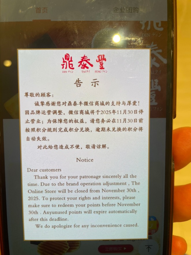 10月10日,鼎泰丰突发消息称,因品牌运营调整,鼎泰丰微信商城将于2025年11月30日停止营业。顾客务必在11月30日前按照积分规则完成积分兑换,逾期未兑换的积分将自动失效。 ![]() 图:鼎泰丰微信官方商城告示。周良成/摄 公开资料显示,鼎泰丰于1958年在中国台湾地区成立,以18褶小笼包闻名,被誉为“全球最有名的小笼包品牌”,在美国、日本、韩国、新加坡、阿联酋等国家,以及香港等地区开设160家分店。 ![]() 图:鼎泰丰罗湖万象城店菜单局部。周良成/摄 在中国大陆,高峰时期,鼎泰丰的门店数量一度超过30家。近年来,因为经营情况不佳,鼎泰丰在大陆已经关闭十多家门店。鼎泰丰官网资料显示,目前鼎泰丰在大陆地区的门店仅剩下13家。其中,上海有7家,广州有2家,杭州、无锡、苏州和深圳各有一家门店。 目前,深圳仅罗湖万象城还有一家鼎泰丰门店。10月11日,记者前往鼎泰丰罗湖万象城店,店员告诉记者:“之前深圳有两家门店,之前在福田平安大厦附近有一家门店,现已闭店。目前深圳仅剩这一家店。” 当记者问到鼎泰丰微信商城停止营业对深圳唯一的门店会有何冲击时,店员表示:“ 鼎泰丰微信商城停止营业与我们线下门店的经营关系不大,我们这家门店目前一切经营正常,也并没有接到公司任何关于会关闭深圳这家线下门店的通知。” ![]() 图:鼎泰丰罗湖万象城店。周良成/摄 据悉,在2024年,北京恒泰丰餐饮有限公司关闭了华北14家鼎泰丰门店,其原因是公司营业执照二十年期限已满且董事会未能就续展达成一致意见。北京恒泰丰餐饮有限公司是鼎泰丰在大陆的门店运营主体之一,负责运营鼎泰丰在北京、天津、青岛、厦门、西安等城市的门店。 ![]() 图:鼎泰丰罗湖万象城店的厨房。周良成/摄 而上海广成餐饮管理有限公司是鼎泰丰在大陆的另一运营主体,负责运营鼎泰丰在上海、苏州、无锡、南京、嘉兴、杭州、宁波、广州、深圳等城市的门店。 记者查询鼎泰丰微信商城发现,目前该商城仅有一款芝麻煎饼可供出售,其余商品均已售罄,或者下架。 ![]() 图:鼎泰丰微信官方商城。周良成/摄 值得注意的是,在关闭微信商城、部分门店的同时,鼎泰丰仍在拓展新的门店。鼎泰丰官方微信显示,2026年3月,鼎泰丰北京嘉里中心门店将开业,届时该品牌将重返北京。不过,该店由上海广成餐饮管理公司负责运营。此外,今年5月5日,鼎泰丰在加拿大温哥华的门店开业。 (文章来源:深圳商报·读创) |