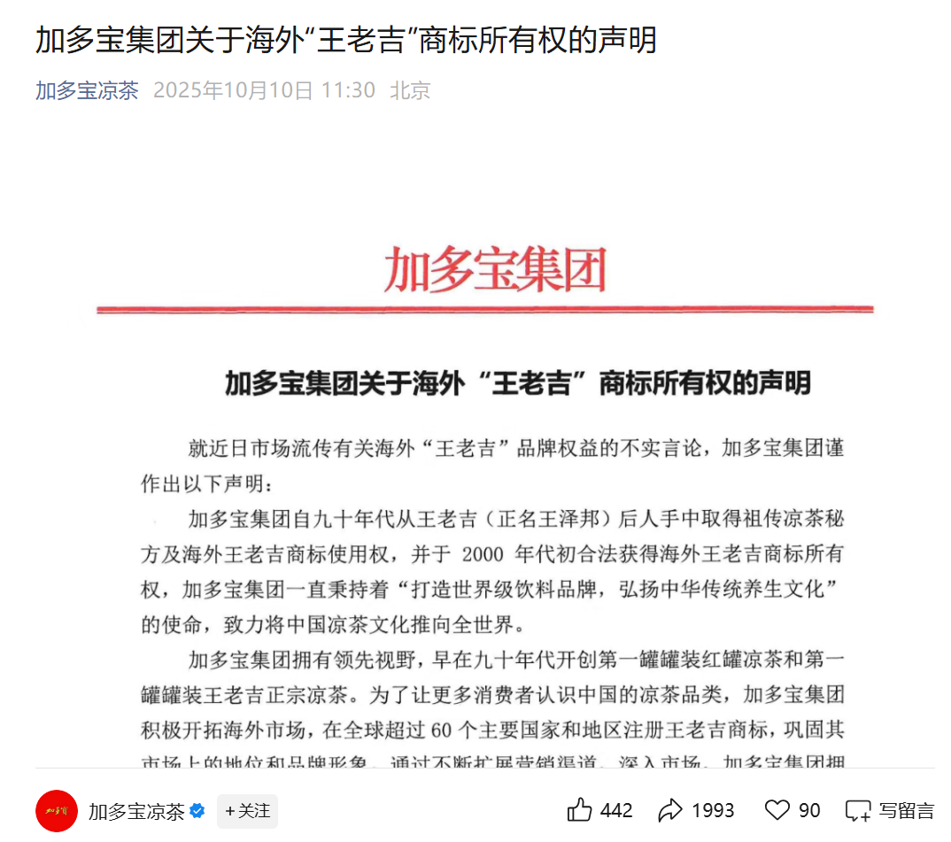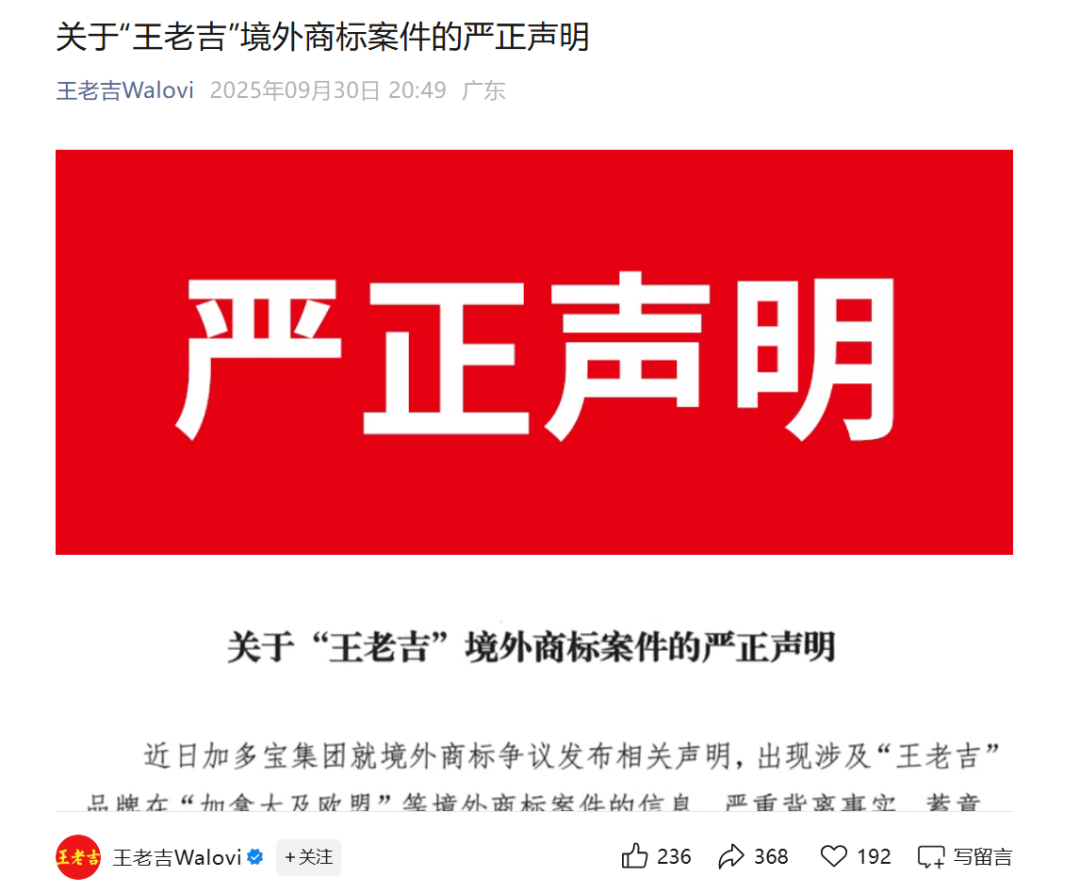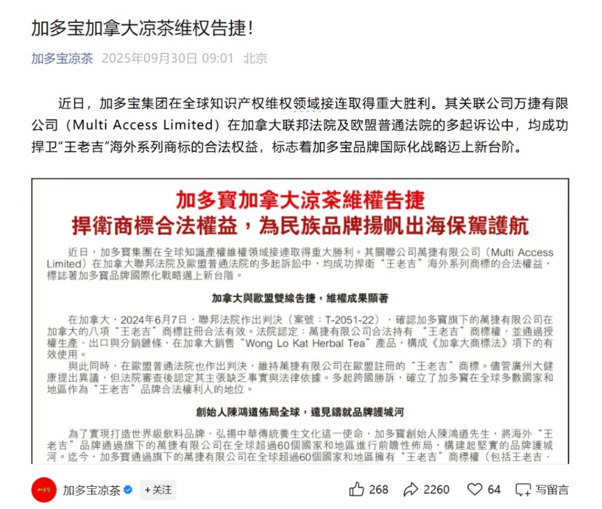 王老吉、加多宝商标之争,再起波澜。 10月10日,加多宝官方发布关于海外“王老吉”商标所有权的声明。 ![]() 加多宝在声明中称,其自二十世纪九十年代从王老吉(正名王泽邦)后人手中取得祖传凉茶秘方及海外王老吉商标使用权,并于2000年初合法获得海外王老吉商标所有权。 “为了让更多消费者认识中国的凉茶品类,加多宝集团积极开拓海外市场,在全球超过60个主要国家和地区注册王老吉商标,巩固其市场上的地位和品牌形象。通过不断扩展营销渠道,深入市场,加多宝集团拥有的海外王老吉品牌凉茶至今已远销全世界数十多个国家和地区。”加多宝表示。 对此,王老吉官方公众号发文“回怼”称:“有病去医院,有事找法院。谢谢!” ![]() 这已经是双方本次商标之争的第二轮交锋。本次“口水战”起因是双方积极开拓海外市场。今年8月,王老吉正式将英文标识“WALOVI”定为国际核心品牌,同步推出四款国际罐产品。 9月30日,加多宝官方发文称,加多宝加拿大凉茶维权告捷。 ![]() 上述文章称:“近日,加多宝集团在全球知识产权维权领域接连取得重大胜利。其关联公司万捷有限公司(Multi Access Limited)在加拿大联邦法院及欧盟普通法院的多起诉讼中,均成功捍卫‘王老吉’海外系列商标的合法权益,标志着加多宝品牌国际化战略迈上新台阶。” “王老吉Walovi”则于9月30日晚间发布《关于“王老吉”境外商标案件的严正声明》进行回应。 ![]() 该声明称:“加多宝集团就境外商标争议发布相关声明,出现涉及‘王老吉’品牌在‘加拿大及欧盟’等境外商标案件的信息,严重背离事实,蓄意误导公众认知,对公司合法权益与品牌声誉造成严重损害。” 该声明谈及,“王老吉”品牌起源于清代道光年间,现“王老吉”商标的所有人为广州白云山医药集团股份有限公司,“王老吉”品牌的历史沿革资料、知识产权权属的法律文件均完整清晰。截至2025年9月30日,“王老吉”品牌权利人广州白云山医药集团股份有限公司、广州王老吉大健康产业有限公司已在全球100多个国家和地区完成“王老吉”“WALOVI”等系列商标注册工作,商标权利明确,法律保护完备。 王老吉还表示,加多宝集团通过海外离岸关联公司万捷有限公司在全球60余个国家和地区进行恶意注册,干扰公司正常拓展海外业务。针对加多宝集团行径,王老吉已采取维权行动。 记者注意到,目前,加多宝集团注册的英文商标是“WANG LAO JI”和“WONG LO KAT”,王老吉注册的英文商标是“WALOVI”,双方注册的英文商标不同,但中文标识“王老吉”相同。 回溯这场漫长的商标之争,早在2012年,中国国际经济贸易仲裁委员会裁定,广州医药集团有限公司(简称“广药集团”)与加多宝母公司鸿道集团签订的《“王老吉”商标许可补充协议》和《关于“王老吉”商标使用许可合同的补充协议》无效,鸿道集团停用“王老吉”商标。鸿道集团因此向北京市第一中级人民法院提起了撤销该裁决的申请,但遭到驳回。 2014年,广药集团发起商标侵权诉讼。2018年,广东省高级人民法院一审判决加多宝赔偿广药集团14.4亿元。当事双方因不服该判决提起上诉,最高人民法院裁定撤销该判决,发回广东省高级人民法院重审。2023年,广东省高级人民法院就广药集团与加多宝商标权纠纷案作出一审判决,认定六家加多宝公司共同侵权,判决其赔偿3.17亿元。对此,加多宝称将向最高人民法院提起上诉。 此外,双方围绕红罐包装也展开了长达数年的激烈纷争。2017年8月16日,最高人民法院终审判决认为,广药集团与加多宝对涉案“红罐王老吉凉茶”包装装潢权益的形成均作出了重要贡献,双方可在不损害他人合法利益的前提下,共同享有“红罐王老吉凉茶”包装装潢的权益。 (文章来源:上海证券报) |