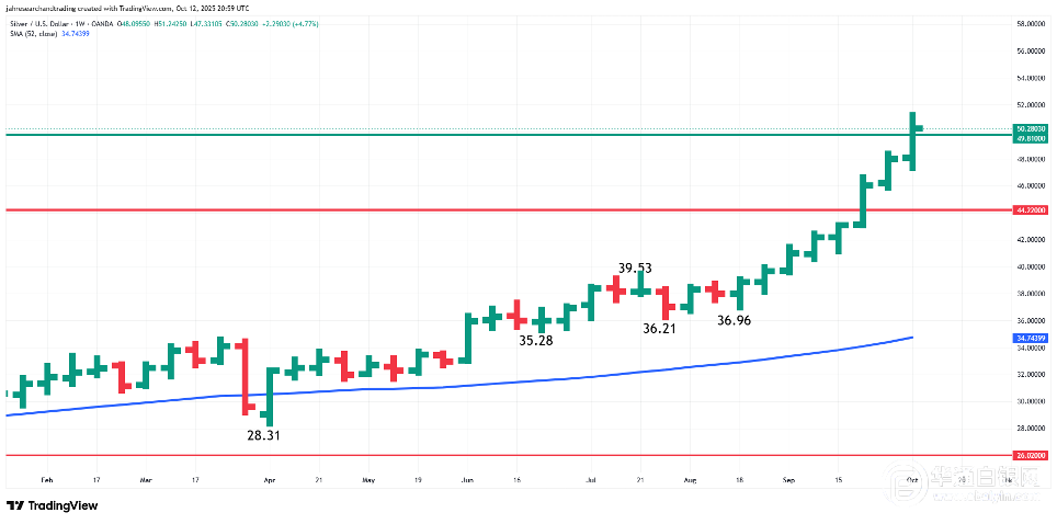 【华通白银网10月13日讯】•交易员押注美联储将在本月底降息,鲍威尔即将发表的讲话将影响白银的下一步走势。 •白银现货溢价预示着现货供应紧张,2025年白银期货交易价格将比现货价格低逾2美元。 •特朗普对中国的关税威胁重振了避险需求——如果地缘政治紧张局势升级,或将利好白银。 白银稳守50美元上方,交易商关注鲍威尔讲话和CPI公布时间 白银连续第二周上涨,白银收于50.28美元,上涨2.29美元,涨幅4.77%。银价轻松超过49.81美元的长期上限,并守住了近10多年来的高点。多头仍然掌控市场,但由于市场情绪紧张,加上新闻头条不断,本轮涨势的下一回合将取决于本周的走势。 鲍威尔讲话备受关注,降息押注保持坚挺 市场继续严重依赖于降息预期。芝加哥商品交易所美联储观察工具显示,交易员预计在10月29日的下一次联邦公开市场委员会会议上降息25个基点的可能性为95%。但随着政府第四周停摆,包括9月份CPI在内的关键数据被推迟发布,市场一片茫然。 这就是为什么美联储主席鲍威尔定于周二在全国商业经济协会的演讲受到如此多关注。由于就业数据被推迟,而通胀在美联储上次声明中仍被标记为“有些升高”,鲍威尔的语气可能比平时更有分量。如果他暗示美联储将劳动力风险置于通胀粘性之上,银价可能会迎来另一波上涨。 9月份CPI报告已改至10月24日发布。在那之前,市场对通胀是盲目的,这对双方都增加了风险。 紧张的实物供应仍支撑底部 除却利率预期因素,白银市场的深层逻辑依然看涨。白银处于现货溢价状态,2025年12月期银较现货低逾2美元。这种价格结构十分罕见,表明实物需求超过了供应,而且供应紧张的情况并没有缓解。ETF资金流入依然强劲,且有迹象显示实物白银供给日趋紧张。 展望:多头主导市场,但需关注鲍威尔讲话和关税 (白银周线图) 更有可能的是,白银仍希望走高,尤其在鲍威尔倾向鸽派的情况下。突破51.24美元可能会打开通往52美元甚至54美元的道路。另一方面,如果鲍威尔讲话倾向鹰派或暗示政策耐心,预计会出现一些获利回吐,令银价向49.28或47.33美元回落。 同样影响市场的还有新一轮的贸易战噪音。特朗普威胁要对中国征收全面新关税,这再次引发了重大风险,任何升级都可能推高避险需求,包括白银。 截止北京时间09:40,华通现货白银定盘价报11206元。 美国时间10月10日,全球最大白银ETF——iShares Silver Trust的白银持仓量为15443.76吨,较前一交易日减少8.47吨。全球最大黄金ETF—SPDR GOLD TRUST的黄金持仓量为1017.16吨,较前一交易日增加3.72吨。 白银网 |