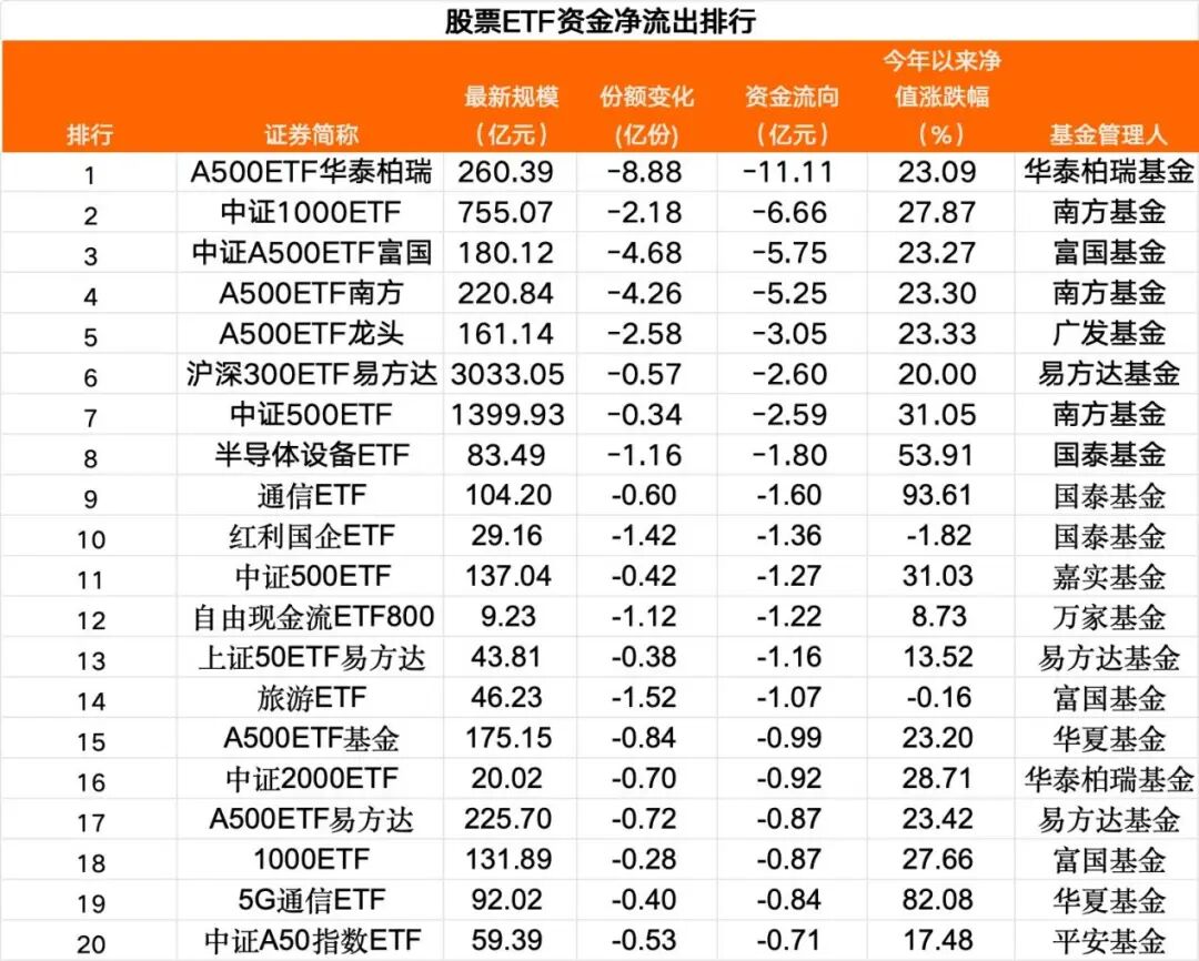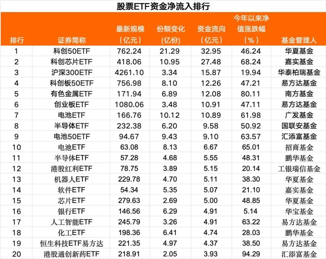 10月10日(上周五),A股市场迎来显著调整,三大指数集体收跌,前期热门赛道股回调明显,创业板指跌幅更是超过4.5%,两市成交约2.52万亿元。 急跌行情下,部分资金选择入场。 股票ETF市场资金流向数据显示,上周五股票ETF资金净流入超300亿元,科创50ETF、创业板ETF等宽基ETF,以及半导体、电池、有色等行业ETF产品资金净流入居前;中证A500ETF、中证1000ETF等宽基ETF,以及自由现金流、通信等行业主题ETF净流出较多。 上周五股票ETF净流入超300亿元 据Wind数据统计,截至10月10日,全市场1224只股票ETF(含跨境ETF)总规模为4.59万亿元。 股票ETF资金流向显示,上周五市场调整之下,资金以流入为主。据测算,当日股票ETF净流入接近315亿元。 从资金净买入排行榜看,当日净流入1亿元以上的股票ETF有81只,部分宽基ETF净流入居前。其中,华夏科创50ETF、嘉实科创芯片ETF、华泰柏瑞沪深300ETF位居前三,资金净流入均超15亿元。 值得一提的是,伴随国际金价强势上攻,商品型黄金ETF再度获得资金青睐,仅上周五资金净流入便超20亿元。 另据Wind统计,资金净流入前20大股票ETF中,科创50ETF有2只,沪深300、创业板等指数相关ETF各有1只,半导体芯片ETF、电池ETF各有3只。从近5日角度观测,近期资金流入中证A500指数相关ETF超93亿元,流入科创50指数相关ETF超62亿元。 头部基金公司中,截至10月10日,易方达基金旗下科创板50ETF净流入12.26亿元;创业板ETF净流入10.91亿元,最新规模超1080亿元,位居同类第一;人工智能ETF净流入4.91亿元,最新规模超245亿元,位居同类第一;恒生科技ETF易方达净流入4.37亿元;机器人ETF易方达净流入1.6亿元。 华夏基金旗下ETF中,10月10日,科创50ETF和机器人ETF单日净流入居前,分别净流入32.95亿元和5.11亿元,最新规模分别达762.24亿元和229.78亿元,对应跟踪指数近一月日均成交额分别为62.34亿元和20.37亿元。芯片ETF净流入5亿元,有色金属ETF华夏、新能源车ETF、科创人工智能ETF华夏净流入都超3亿元。 部分宽基ETF净流出居前 10月10日,部分股票ETF整体净流出资金较多。 从资金净流出情况来看,上周五当天,股票ETF中有14只净流出资金超过1亿元,跟踪中证A500指数、中证1000指数、中证500指数等相关宽基ETF,以及半导体设备、通信等行业主题ETF“失血”相对靠前。 在净流出前20大股票ETF中,6只中证A500ETF净流出资金超过25亿元,中证1000ETF、中证500ETF各有2只,资金净流出分别超过7.5亿元和3.85亿元。此外,自由现金流、通信等行业主题ETF资金净流出也较多。 10月以来两个交易日,股票ETF资金净流入已超400亿元,跟踪科创板指数、创业板指、沪深300指数等相关宽基ETF,以及电池、芯片、有色等行业ETF资金净流入较多,中证A500等相关ETF则成资金“失血”主阵营。 易方达基金表示,上周末,中美在航运、贸易、科技、稀土等领域的博弈升级,海外市场波动明显加剧。但从VIX指数来看,市场恐慌程度低于4月“对等关税”时期。市场逢低关注的方向包括黄金、科创50指数、半导体设备、信创、稀土等。 银河基金认为,整体来看,近期市场“高切低”特征显著。对于后市,该机构认为,国庆和中秋长假期间,资源安全主线的市场关注度有所提升,人工智能领域从企业级应用向消费级应用扩散的趋势逐步清晰,用户入口竞争或推动端侧硬件及相关应用领域增长。中美元首通话释放风险展望稳定的信号;美元走弱与海外部分经济体降息预期,或为国内政策宽松提供条件。 |
