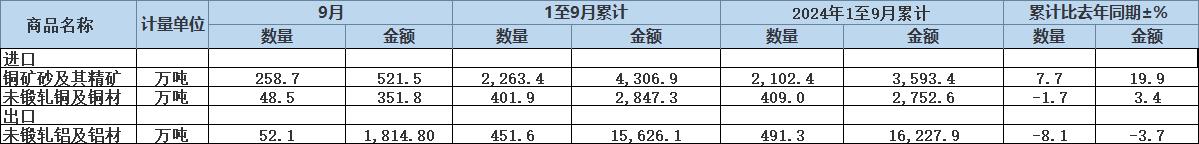 中国9月未锻轧铜及铜材进口量为48.5万吨,1-9月累计进口量为401.9万吨,同比减少1.7%。