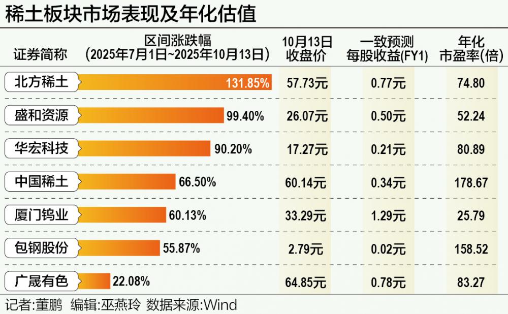 经过今年9月的集体回调,稀土板块节后再度爆发。 10月13日,Wind稀土板块涨幅达9.49%,位列所有热门概念板块首位,其中包钢股份、北方稀土和中国稀土等多只成分股涨停。 有卖方机构表示,“需求端稀土传统旺季渐行渐近,供需格局或持续向好,稀土价格或稳中有进,持续推荐稀土产业链战略配置价值。” 今年受稀土产品战略价值提升的刺激,上述样本公司此前已经积累了非常可观的涨幅,并获得二级市场的估值溢价。 以北方稀土为例。截至13日收盘,该公司年内涨幅超过170%,如果按照全年28亿元的卖方盈利预期值估算,公司当前估值已经达到75倍,而估值超过百倍的稀土股亦不罕见。 反超2021年周期高点 与火热的二级市场相比,稀土行业层面表现相对理性。 根据SMM调研,10月13日,从稀土精矿、稀土氧化物、稀土金属到钕铁硼毛坯等多稀土产品出现下行,仅氧化镝价格因头部企业的采购活动增多而出现小幅上调。 就上述几家企业经营趋势来看,虽然今年整体迎来业绩拐点,但受自身营收结构、业务模式等因素影响,盈利弹性较为一般。 比如包钢股份,公司拥有全球最大的稀土原料基地,以及每年45万吨稀土精矿生产能力,但其稀土产品很难对公司业绩起到决定性作用,而是更多受到板材、管材、型材等钢材产品价格波动的影响。 比如2024年,在包钢股份681亿元的收入总额中,各类钢材产品营收占比达到77%。今年上半年,在稀土行业景气度提升的背景下,包钢股份归母利润也不过1.5亿元,同比增长40%。 作为其下游的冶炼分离企业北方稀土,因为需要承担稀土精矿的上涨成本,今年前三季度业绩表现也只能算是稳步增长。 北方稀土上周末发布的业绩预告显示,公司预计前三季度归母净利润为15.1亿元至15.7亿元,同比增加272.54%到287.34%。 由此计算,该公司今年前三季度归母净利润分别为4.3亿元、5亿元、5.8亿元至6.4亿元,呈逐季度放大的趋势。 不过,这一盈利增速放在基础原材料领域较为常见,并不算特别突出。 此外,抛开四季度稀土精矿价格大涨带来的成本抬升影响不说,仅就卖方机构给出的盈利预期来看,全年28亿元左右的归母利润预期值也已经十分乐观。 而这还远远无法与历史周期高点相比,2021年、2022年北方稀土归母利润均超过50亿元。 然而,虽然北方稀土盈利能力没有回到周期高点,其股价却已经十分接近2021年的高点。 历史数据显示,北方稀土的历史高点为2021年9月的60.58元(前复权2),今年8月末高点为58.83元,公司最新价为57.73元。 这也不是个例。8月末至9月初期间,中国稀土、广晟有色的股价更是已经反超2021年的周期高点。 不难看出,受到行业景气度提升的带动,各家稀土企业盈利确有一定好转,却非推动其股价上涨的核心原因。 特定时期的估值红利 今年4月,商务部会同海关总署发布关于对钐、钆、铽、镝、镥、钪、钇等7类中重稀土相关物项实施出口管制措施的公告,并于发布之日起正式实施。 10月9日,商务部发布2025年第61号公告,对含有中国成分的部分境外稀土相关物项实施出口管制。 “管制范围从境内扩展至境外,新增稀土二次资源回收利用相关技术及生产线装配、调试、维护等技术的出口管制,基本覆盖稀土全产业链,并首次涉及半导体及人工智能领域,稀土供给刚性或进一步加强。”中信证券分析指出。 10月9日以来稀土板块连续异动,至今Wind稀土指数也已经取得14%左右的上涨。 国内出口政策的变化、稀土战略价值的提升,所引发的市场投资成为了今年左右稀土板块运行的最主要变量。 仅以北方稀土为例,公司股价迅速上涨始于今年三季度,截至10月13日收盘公司下半年涨幅已经达到131.85%。 根据Wind卖方一致性盈利预测,该公司2025年归母净利润27.9亿元(需要四季度盈利12.2亿元),对应每股收益为0.77元。 按照6月末股价计算,公司估值在32倍左右。但是经过近几个交易日的大幅上涨,北方稀土股价重返历史高位,根据57.73元最新价估算的年化估值达到74.97倍。 其他稀土企业的估值水平,同样十分可观。 采用以上相同标准估算,中国稀土、广晟有色、盛和资源等样本公司的年化估值分别在177倍、83倍和52倍左右。 这放在其他基础原材料行业非常少见,即便是市场关注度同样很高的黄金、铜等细分领域,30倍的估值就已经是几家行业龙头触不可及的估值天花板。 由此可以看出,上述机构提及的价值重估早已启动,而目前稀土板块或已面临着估值过高的问题。 这是否会构成其股价进一步上涨的阻碍,尚待后续二级市场给出答案。 |