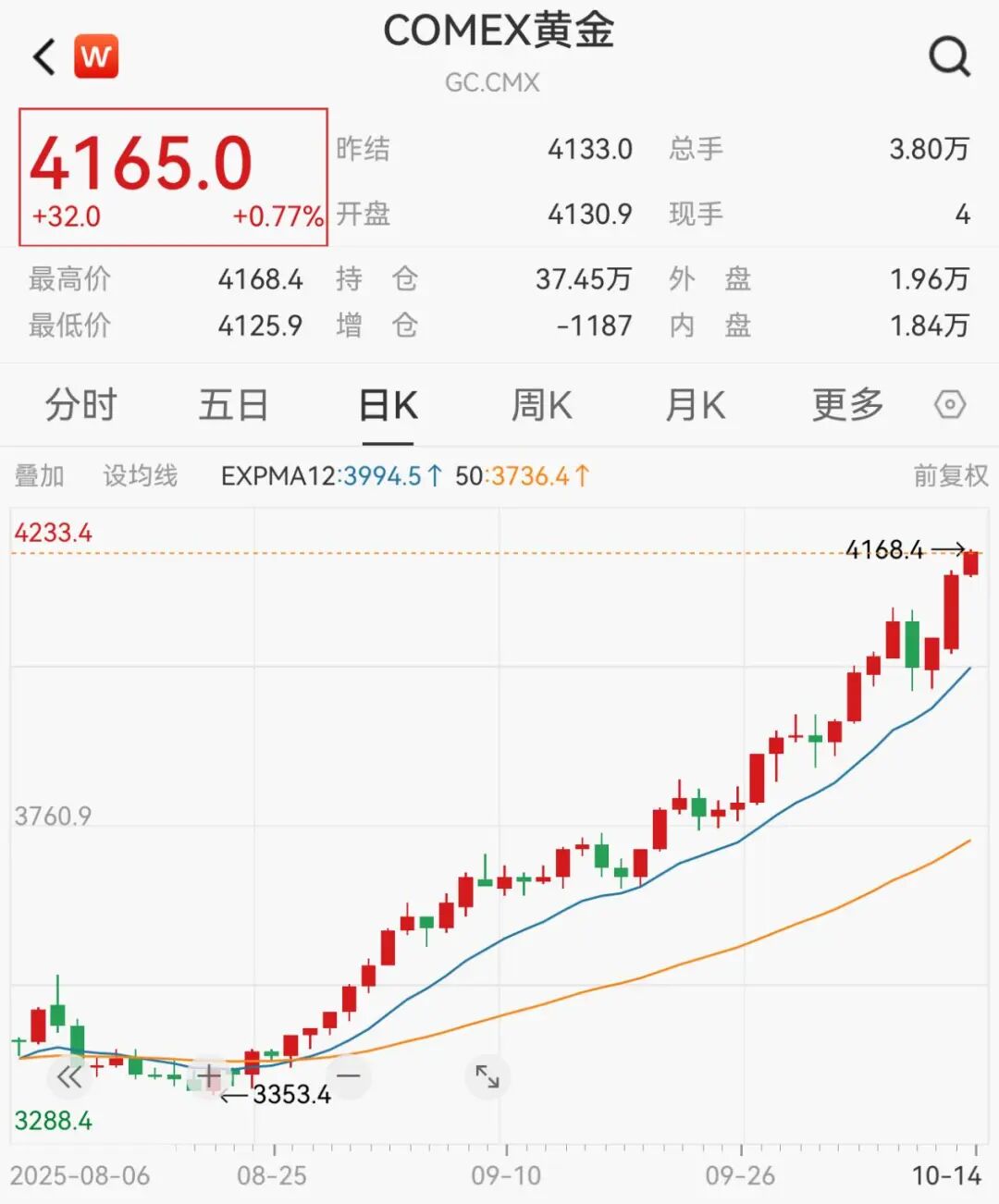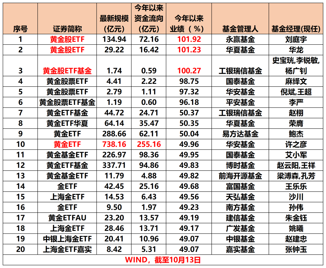 金价迭创新高! 10月14日盘中,国际金价持续拉升,截至发稿,伦敦现货黄金价格站上4140美元/盎司,COMEX黄金期货价格站上4160美元/盎司,续刷历史新高。 伴随金价大涨,黄金主题ETF规模一举突破2000亿元大关。与此同时,黄金主题ETF诞生了3只“翻倍基”。 业内人士表示,中长期“美联储开启降息周期+海外宏观政策不确定性加剧+全球去美元化趋势”格局对金价构成一定支撑。但需警惕短期回调,黄金资产波动性可能上升,投资者应做好风险防范。 黄金主题ETF规模突破2000亿元大关,诞生3只“翻倍基” Wind数据显示,截至10月13日,今年以来,黄金主题ETF产品资金净流入达745.77亿元,最新规模突破2000亿元,达2033.42亿元,较去年年末增长超180%。 具体来看,有5只黄金主题ETF跻身“百亿俱乐部”。其中,华安黄金ETF年内“吸金”255.16亿元,目前规模遥遥领先,高达738.16亿元,较去年年末增长近160%。 此外,博时黄金ETF、国泰黄金基金ETF、永赢黄金股ETF、易方达黄金ETF等也成为“吸金”大户,今年以来资金净流入在62亿~98亿元区间。 业绩方面,截至10月13日,黄金主题ETF年内单位净值增长率均为正,平均值为64.55%。 永赢、华夏、工银瑞信基金旗下黄金股ETF成为“翻倍基”;国泰、华安、平安基金旗下黄金股票ETF今年以来业绩均在95%以上。 多因素对金价中长期或有一定支撑,仍需警惕短期回调风险 金价持续攀升,对于后市,国泰基金认为,从长期看,美国政治僵局加剧、财政纪律弱化,正在逐步侵蚀美元作为全球储备货币的基础。此外,关税冲突再起,市场避险情绪增强。短期看,金价受到多因素驱动有望上行。同时,需关注中东地缘局势出现缓和迹象、投机资金获利了结等因素带来的回调风险。中长期“美联储开启降息周期+海外宏观政策不确定性加剧+全球去美元化趋势”格局对金价构成一定支撑。 华安基金表示,展望后市,短期内关税冲突加剧促成黄金脉冲式行情,中长期看,美联储降息周期、美债信用危机、全球秩序重构、央行持续购金等多重趋势对黄金构成利好,黄金仍行进在新周期的路上。 但风险不容忽视。博时基金提示,若后续美国经济数据超预期强劲,影响降息实施路径,且伴随美元指数反弹,黄金可能阶段性受压。同时,经历了年度大幅上涨后,黄金资产的波动性可能上升,投资者应做好风险防范。 |