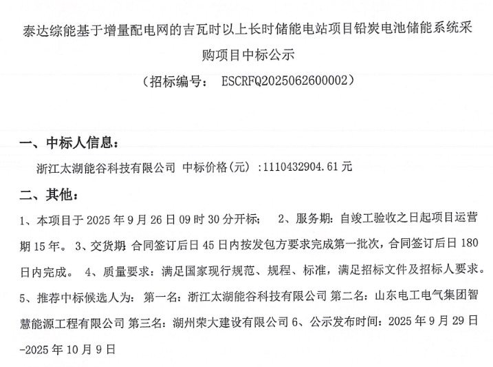 北极星储能网获悉,9月29日,泰达综能基于增量配电网的吉瓦时以上长时储能电站项目铅炭电池储能系统采购项目中标公示,浙江太湖能谷科技有限公司中标该项目,中标价格为1110432904.61元,折合单价1.074元/Wh。此外,山东电工电气集团智慧能源工程有限公司和湖州荣大建设有限公司分列第二、第三名。 招标人为天津泰达综合能源服务有限公司,由国有控股的天津泰达电力有限公司全资持股。 项目位于天津市滨海新区第六大街、欣泰街、泰华路和泰欣路之间,原天津顶园食品有限公司厂区位置,占地27899平方米。本项目储能功率不低于174MW,系统容量不低于1034MWh,由6个16MW储能单元、4个12W储能单元、3个6MW储能单元、3个4MW储能单元组成。 本招标项目划分为1标段,本次招标为其中的:(001)承包人的供货范围为储能系统,包括电化学类电池(铅炭电池)、电池支架(钢平台)、运维平台、电池管理系统、储能变流器PCS、升压变压器(不含安装调试)、储能并网柜(不含安装调试)以及储能区控制系统、储能区供电系统(储能部分用电从低压配电柜取电)、温控(液冷)系统及储能系统继电保护及自动化装置、微机五防系统、交直流电源、通信设备、主控室显示屏等设备、设备间的连接线缆(直流电缆、交流动力电缆、控制电缆以及通信线缆等设备的供货、安装、调试),同时负责项目投运后的第五年末、第十年末更换(拆除及安装)铅炭电池单体(电池模块、电池等)及其附件,并负责产品更换后的系统调试等。 |