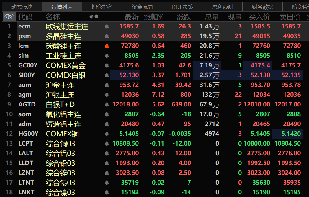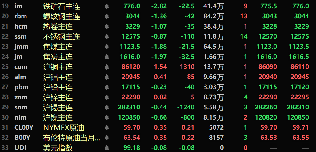 SMM10月14日讯: 金属市场方面: 截至午间收盘,内盘基本金属涨跌互现,沪铜涨1.54%。沪铝涨0.41%%,沪铅跌0.23%,沪锡跌0.44%,沪镍跌跌0.66%,沪锌微涨。 此外,铸造铝主连期货涨0.47%,氧化铝主连跌0.64%。碳酸锂主连涨0.64%,工业硅主连跌2.35%。多晶硅主连涨0.58%。 黑色系均飘绿,铁矿跌2.82%,螺纹跌1.36%,热卷跌1.07%,不锈钢跌0.87%。双焦方面:焦煤主力合约跌1.88%,焦炭主力合约跌1.97%。 外盘金属方面,截至11:52分,LME金属涨跌互现,伦铜涨跌0.11%,伦铝涨0.43%,伦锌微涨,伦铅涨0.2%,伦镍、伦锡微跌。 贵金属方面,截至11:52分,COMEX黄金涨1.03%,盘中刷新历史新高至4176.5美元/盎司;COMEX白银涨3.37%,盘中刷新历史新高至52.315美元/盎司。内盘贵金属方面:沪金主连涨4.31%,盘中刷新历史新高至953.96元/克;沪银主连涨7.12%,盘中刷新历史新高至12048元/千克。全球最大黄金上市交易基金(ETF)--SPDR Gold Trust公布,截至周一(10月13日),其黄金持仓量为1018.88吨,增加1.72吨,或0.17%。 美国银行和法国兴业银行分析师目前预测,到2026年黄金将达到5,000美元,而渣打银行则将2026年的平均预测值上调至4,488美元。 截至午间收盘,欧线集运主力合约涨1.69%,报1585.7点。 截至10月14日11:52分,部分期货午间行情: 》10月14日SMM金属现货价格 现货及基本面 银:今日银价继续大幅上涨,伦敦现货价格突破52美元/盎司,国内现货价格同步上涨。日内TD-沪银主力2512合约基差维持30-40元/千克。早盘上海地区大厂银锭对TD升水10-15元/千克报价刚需成交……》点击查看详情 宏观面 国内方面: 【国家发改委:支持电力、钢铁、有色、建材、石化、化工、机械等重点行业节能降碳改造】国家发展改革委印发《节能降碳中央预算内投资专项管理办法》。《办法》提到,重点行业领域节能降碳项目。支持电力、钢铁、有色、建材、石化、化工、机械等重点行业节能降碳改造。支持以工业园区、产业集群为载体整体部署并规模化实施的节能降碳改造。支持供热、算力等基础设施节能降碳改造。支持中央和国家机关节能降碳改造。《办法》提到,煤炭消费清洁替代项目。支持煤电机组和煤化工项目低碳化改造。》点击查看详情 【国家能源局:8月全国新增建档立卡新能源发电项目共8658个】国家能源局公告,2025年8月,全国新增建档立卡新能源发电(不含户用光伏)项目共8658个,其中风电项目23个,光伏发电项目8624个(集中式光伏发电项目50个,工商业分布式光伏发电项目8574个),生物质发电项目11个。 【央行公开市场今日净投放910亿元】央行今日开展910亿元7天逆回购操作,操作利率为1.40%,与此前持平。因今日无逆回购到期,当日实现净投放910亿元。 ►10月14日银行间外汇市场人民币汇率中间价为1美元对人民币7.1021元 美元方面: 截至11:52分,美元指数跌0.08%,报99.18。美国财政部长贝森特(Scott Bessent)周一表示,美国联邦政府持续停摆已开始影响美国经济。与此同时,费城联邦储备银行总裁保尔森表示,就业市场面临的风险上升,意味着美联储应进一步降息,而关税对通胀的推升作用可能不如此前预期的大。美国联邦储备理事会(美联储/FED)主席鲍威尔(Jerome Powell)周二将在全国银行家协会(NABE)年会上发表讲话,这可能会为降息提供新的线索。市场仍预计美联储将在本月会议降息25个基点,并在12月进行类似的降息。(文华综合) 数据方面: 今日将公布澳大利亚截至10月12日当周ANZ消费者信心指数,德国9月CPI年率终值、 德国10月ZEW经济景气指数,英国8月失业率-按ILO标准、英国8月包括红利三个月平均工资年率,欧元区10月ZEW经济景气指数等数据。 此外,美联储理事鲍曼发表讲话,美联储主席鲍威尔在全美商业经济协会举办的活动上发表讲话,美国总统特朗普与阿根廷总统米莱会晤。澳洲联储公布9月货币政策会议纪要。2026年FOMC票委、费城联储主席保尔森发表讲话。日本央行行长植田和男于10月14日至19日访问美国。 原油方面: 两油期货均小幅上涨,截至11:52分,美油涨0.35%,布油涨0.35%。贸易紧张局势缓和的初步迹象提振了市场情绪,缓解了市场对全球燃料需求的担忧。 特朗普周一宣布长达两年的加沙战争结束,这限制了油市的上行空间。与此同时,石油输出国组织(OPEC)在周一的月报中称,随着OPEC 推进增产计划,石油市场的供应缺口将在2026年缩小。(文华综合) 现货市场一览: ►采销情绪较为平淡 沪铜现货升水走跌【SMM沪铜现货】 ►铜价大涨下游补货欲低迷 整体交投不佳【SMM华南铜现货】 ►供需双弱格局延续 市场活跃度不及昨日【SMM华北铜现货】 ►华东地区铝锭去库 成交情绪回暖现货贴水收窄【SMM铝现货午评】 ►再生铅:持货商出货情绪稍微下滑 下游刚需补库成交尚可【SMM铅午评】 ►上海锌:下游接货意愿不高 成交多为刚需【SMM午评】 ►宁波锌:现货升水持稳 下游刚需采购【SMM午评】 ►供需紧平衡支撑锡价高位运行 短期关注28万元支撑位【SMM锡午评】 ►【SMM镍午评】10月14日镍价再次逼近12万元价位,贸易摩擦担忧持续发酵 ►【SMM硫酸镍日评】10月14日 镍盐价格有所上涨 ►银价持续走强 现货市场流通货源偏紧升水难降【SMM日评】 |