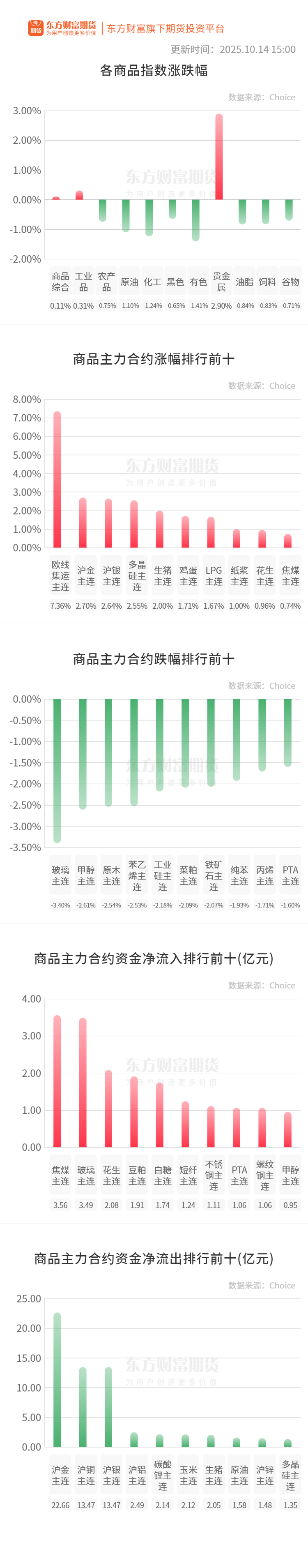 行情纵览![]() 宏观要闻中国证券报·中证金牛座:10月14日,有市场消息称,相关主管部门或将发布一份加强光伏产能调控的文件。对此,中国证券报·中证金牛座记者向接近主管部门的业内人士求证。该人士独家回应称,该文件或将于近日出台,文件内容涉及对全产业链现有产能开工率限制方面的要求,并严禁新增产能,以尽早推动实现产能供需平衡。 交通运输部:为保障我国航运业、造船业及相关产业链供应链安全和发展利益,依据《中华人民共和国国家安全法》《中华人民共和国反外国制裁法》及实施规定、《中华人民共和国国际海运条例》等法律法规,我部会同工业和信息化部等部门对我国航运业、造船业和相关产业链供应链安全和发展利益受美301调查影响或可能影响情况,相关企业、组织或个人是否存在实施、协助、支持美国在航运业、造船业及相关产业链供应链对我国采取歧视性限制措施的行为,及其他相关事项开展调查。后续根据调查情况适时出台相应措施。 央视新闻客户端:最新数据显示,1—9月份,汽车产销量分别完成2433.3万辆和2436.3万辆,同比分别增长13.3%和12.9%。其中,新能源汽车产销量均超过1100万辆,同比增长均超过30%,新能源汽车新车销量达到汽车新车总销量的46.1%。 品种资讯黑色系期货 焦煤:10月14日蒙古国ER公司炼焦煤进行线上竞拍,蒙3#精煤A11、V20-28、S0.85、G75、Mt10起拍价800元/吨,挂牌数量1.28万吨全部成交,成交价格925元/吨,较昨日上涨5元/吨,以上价格均不含税。供货地点为中国甘其毛都口岸监管区,供货时间为付款后90天内,最后供应日期为2026年1月12日。(Mysteel) 铁矿石:中国47港进口铁矿石库存总量14725.14万吨,较上期(9月29日)增加171.18万吨。周期内港口铁矿石存在集中到港现象,港口库存增加的同时压港同步增多。 卫星数据显示,2025年10月6日-10月12日期间, 澳大利亚、巴西七个主要港口铁矿石库存总量1289.7万吨,环比上升51.0万吨,库存延续了上升趋势。当前库存水平略高于下半年以来的均值。(Mysteel) 农产品期货 生猪:截至10月14日14:00时,全国农产品批发市场猪肉平均价格为18.48元/公斤,比昨天上升0.1%。(农业农村部) 白糖:10月14日,我国以进口巴西原糖为原料生产的白糖其销售利润约为1786元/吨(关税配额内,15%关税)或642元/吨(关税配额外,50%关税);我国以进口泰国原糖为原料生产的白糖其销售利润约1724元/吨(关税配额内,15%关税)或562元/吨(关税配额外,50%关税)。(Mysteel) 大豆:10月10日,全国主要油厂进口大豆库存812万吨,较两周前上升42万吨,月环比上升28万吨,同比上升75万吨,较过去三年均值上升289万吨;豆粕库存107万吨,较两周前下降10万吨,月环比下降8万吨,同比上升4万吨,较过去三年同期均值上升39万吨。(国家粮油信息中心) 有色/贵金属期货 工业硅:10月14日,华东不通氧553#在9200-9400元/吨;通氧553#在9300-9500元/吨;521#在9500-9700元/吨;441#在9600-9700元/吨;421#在9600-9800元/吨;421#有机硅用在9800-10300元/吨;3303#在10500-10600元/吨。黄埔港地区个别硅价也下调。昆明、四川、上海、天津、西北、新疆地区硅价持稳。97硅今日价格同样持稳。(SMM) 黄金:受国际金价影响,中国国内珠宝品牌足金首饰价格也出现上涨。14日,从已更新的情况来看,周生生足金饰品价格已涨至1213元/克。公开信息显示,2025年初,上述珠宝品牌足金饰品价格围绕800元/克波动。截至发稿前,年内足金饰品价格每克上涨约400元。(财联社) 能化期货 沥青:今日江苏新海竞拍价格下调30元/吨至3425元/吨,目前汽运成交区间3400-3570元/吨。供应方面,主力炼厂间歇生产,受船发尚可整体库存压力不大;需求方面,下游终端需求不温不火,实际成交氛围一般。(隆众资讯) 橡胶:25民营全乳胶14850元/吨(跌50元),SCR5报价14000元/吨(持平),国营SCR10报价13700元/吨(跌50元),TSR20和民营TSR9710分别报价14100元/吨和14200元/吨(均持平)。价格波动集中在全乳胶和国营SCR10,跌幅均为50元。(隆众资讯) 晚间关注无 (文章来源:东方财富研究中心) |