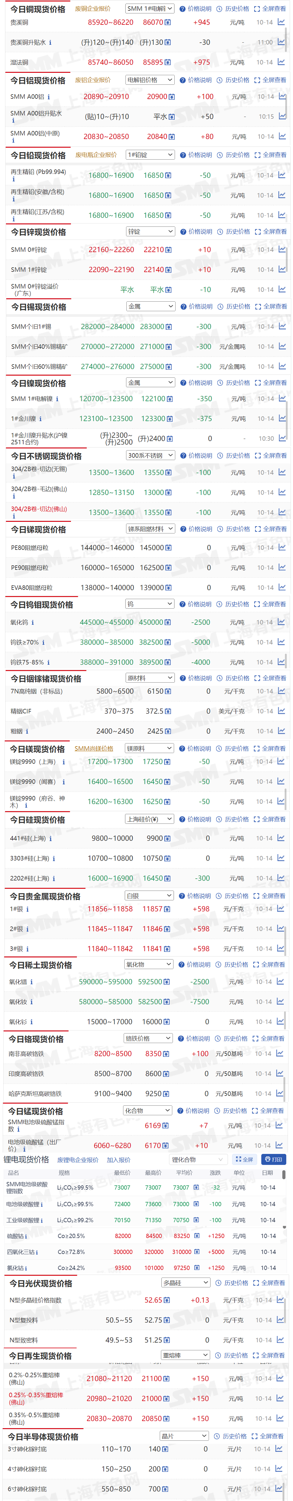 ►金属涨跌互现 沪铜涨幅居前 铁矿领跌 贵金属续创新高 沪银涨逾7%【SMM午评】 ►采销情绪较为平淡 沪铜现货升水走跌【SMM沪铜现货】 ►供需双弱格局延续 市场活跃度不及昨日【SMM华北铜现货】 ►10月14日上海市场铜现货升贴水(第四时段)【SMM价格】 ►SMM 上海及其他1#铅市场:铅市场南北供应差异较大 下游企业仅按需采购【SMM午评】 ►再生铅:持货商出货情绪稍微下滑 下游刚需补库成交尚可【SMM铅午评】 ►SMM 2025/10/14 国内知名再生铅企业废电瓶采购报价 ►上海锌:下游接货意愿不高 成交多为刚需【SMM午评】 ►天津锌:锌价震荡运行 市场成交一般【SMM午评】 ►宁波锌:现货升水持稳 下游刚需采购【SMM午评】 ►广东锌:市场交投氛围较淡 现货升贴水继续走低【SMM午评】 ►供需紧平衡支撑锡价高位运行 短期关注28万元支撑位【SMM锡午评】 ►【SMM镍午评】10月14日镍价再次逼近12万元价位,中美贸易摩擦担忧持续发酵 》点击进入SMM官网查看每日报价 》订购查看SMM金属现货历史价格走势 (建议电脑端查看) |