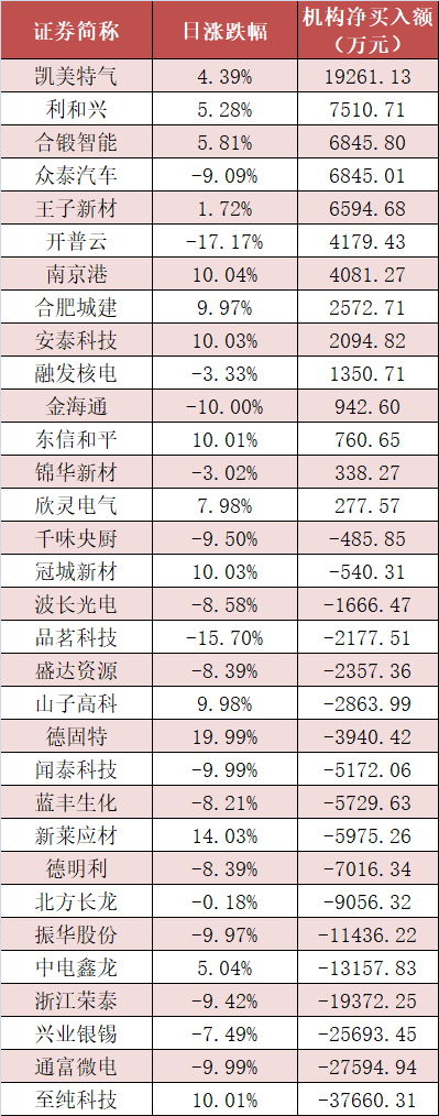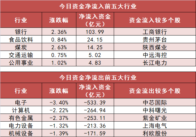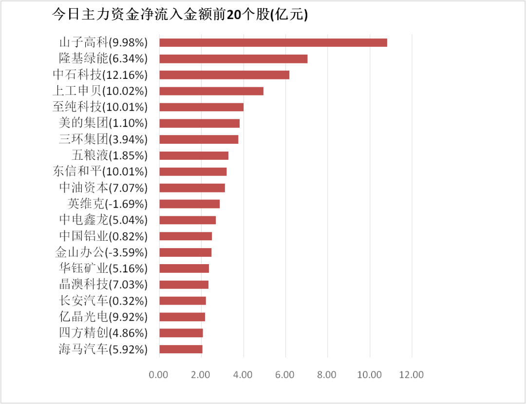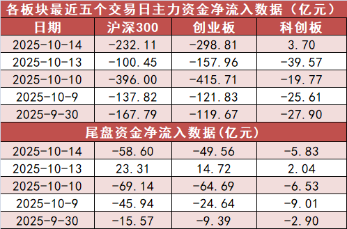 10月14日,A股市场整体下跌。 截至收盘,上证指数收报3865.23点,下跌0.62%,深证成指收报12895.11点,下跌2.54%,创业板指收报2955.98点,下跌3.99%,北证50指数下跌0.22%。A股市场合计成交25969.16亿元,较上一交易日增加2223.82亿元。 1.A股市场全天主力资金净流出629.82亿元 今日A股市场主力资金开盘净流入51.83亿元,尾盘净流出156亿元,A股市场全天主力资金净流出629.82亿元。 2.沪深300今日主力资金净流出232.11亿元 沪深300今日主力资金净流出232.11亿元,创业板净流出298.81亿元,科创板净流入3.7亿元。 3.银行业净流入103.99亿元居首 申万一级行业中,6个行业实现资金净流入,其中银行业净流入103.99亿元居首。 4.山子高科主力资金净流入10.81亿元居首 (注:此表为主力资金净流入统计,与上一张表及下一张表的机构净买入统计口径均不同) 5.龙虎榜机构抢筹多股 盘后龙虎榜数据显示,机构现身多股,其中凯美特气等股票呈现机构资金净买入,至纯科技等股票呈现机构资金净卖出。 6.机构最新关注个股 校对:姚远 |