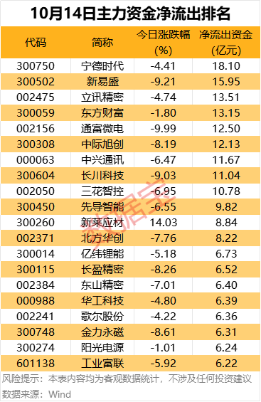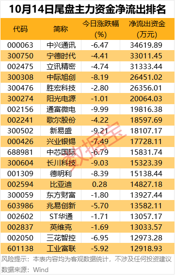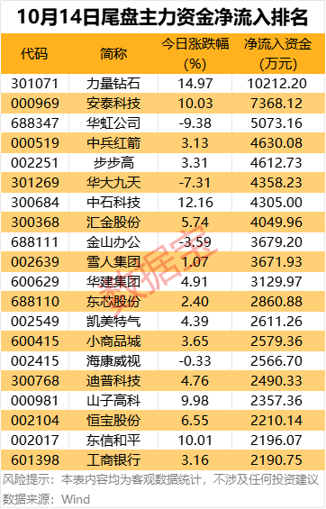 仅3个行业主力资金净流入。 今日(10月14日),A股三大指数集体回调。个股方面,上涨股票数量超过1700只,近50只股票涨停。板块方面,港口航运板块逆市上涨,银行板块持续拉升;半导体板块集体下跌,有色金属板块冲高回落。 从资金情况来看,沪深两市全天主力资金净流出629.82亿元,仅食品饮料、综合、建筑装饰3个行业主力资金净流入,金额分别为2.31亿元、2.22亿元、1.86亿元。 28个主力资金净流出行业中,电子行业净流出金额居首,为172.29亿元;电力设备、有色金属、计算机行业净流出金额均超60亿元;通信、机械设备、基础化工行业净流出金额均超20亿元。 10股获主力资金净流入超3亿元 从个股看,21股获主力资金净流入超2亿元,10股净流入超3亿元。 山子高科主力资金净流入10.81亿元,股价再度涨停,6个交易日内录得4个涨停,累计涨幅为35.43%。消息面上,山子高科新设汽车零部件公司,含电池业务。 隆基绿能主力资金净流入7.02亿元。消息面上,9月隆基绿能共斩获5笔海外组件订单,合计规模为1.787GW,覆盖澳大利亚、美国、罗马尼亚等多个区域市场。 56股主力资金净流出超3亿元,其中,宁德时代、新易盛、立讯精密、东方财富、通富微电、中际旭创等净流出金额均超10亿元。 力量钻石尾盘主力资金净流入超1亿元 尾盘沪深两市主力资金净流出156亿元,仅综合、商贸零售、美容护理3个行业获主力资金净流入,金额均超1500万元。 个股方面,力量钻石尾盘主力资金净流入超1亿元。消息面上,商务部、海关总署日前联合发布公告,对超硬材料、稀土设备和原辅料、钬等5种中重稀土、锂电池和人造石墨负极材料相关物项实施出口管制。 安泰科技、华虹公司、中兵红箭、步步高等尾盘主力资金净流入也均超4000万元。 净流出方面,中兴通讯、宁德时代、立讯精密尾盘主力资金净流出均超3亿元;中际旭创、胜宏科技、阳光电源资金净流出均超2亿元。 |