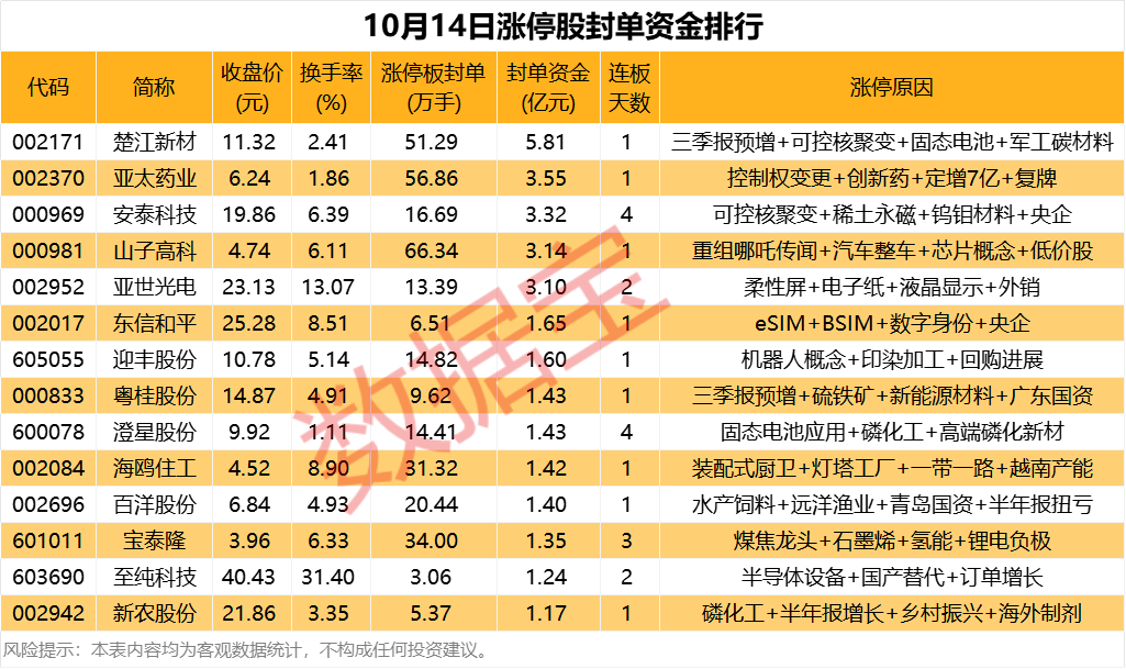 14股封单资金超过1亿元。 涨停战场:5股封单资金在3亿元以上 据证券时报·数据宝统计,10月14日,从收盘涨停板封单量看,山子高科、亚太药业、楚江新材排名前三,依次为66.34万手、56.86万手、51.29万手;宝泰隆、海鸥住工、梅雁吉祥、百洋股份随后,封单量均在20万手以上。 从连续涨停天数看,*ST东易斩获6连板;安泰科技、澄星股份、ST尔雅实现4连板;宝泰隆、合肥城建3连板。 以封单金额计算,14股封单资金超过1亿元。楚江新材封单金额5.81亿元,位居第一;亚太药业、安泰科技、山子高科、亚世光电随后,封单资金均在3亿元以上。 楚江新材预计前三季度实现归母净利润3.5亿元~3.8亿元,同比增长2057.62%~2242.56%。报告期内,公司产品升级与技术改造项目有序投产,产能释放有效驱动了产销规模与营业收入的持续增长;同时公司坚定推进产品升级与精细化管理,产品附加值逐步提升,市场核心竞争力稳步增强。 龙头点睛:煤炭、天然气等资源板块多股涨停 1.煤炭 涨停个股:宝泰隆、大有能源等 宝泰隆:10月13日公司在投资者互动平台称,截至目前公司拥有的七座煤矿合计资源储量47612.27万吨,合计总产能420万吨/年;公司拥有的密林石墨矿区目前已探明晶质石墨矿物量为721.26万吨。 大有能源:大有能源主要从事原煤开采、煤炭批发经营、煤炭洗选加工。2024年公司商品煤产量968.06万吨,商品煤销量953.37万吨。 2.天然气 涨停个股:国新能源、佛燃能源、仁智股份等 国新能源:国新能源是山西省内规模最大的天然气管网运营企业,并享有特许经营权。 佛燃能源:公司以“能源+科技+供应链”为发展方向,深耕城市燃气业务。2025年上半年,公司天然气供气规模较为稳定,实现国内天然气供应量21.31亿方。 3.培育钻石 涨停个股:楚江新材、黄河旋风、*ST亚振等 楚江新材:9月24日公司在投资者互动平台表示,顶立科技研发制备的“高纯碳粉”目前已实现小批量销售,主要应用于锂离子负极材料、SiC单晶、人造钻石、莫桑石、核石墨等领域。 黄河旋风:公司主营超硬材料及制品、超硬复合材料及制品等,主要产品包含工业金刚石、培育钻石等。 龙虎看台:两股净买入额超1亿元 10月14日,两股龙虎榜净买入额超1亿元,分别为山子高科和东信和平,对应金额依次为3.27亿元、1.01亿元;德固特、南京港、新莱福随后,净买入金额依次为7203.09万元、6373.93万元、6306.31万元。 在机构专用席位参与交易的个股中,凯美特气、利和兴、众泰汽车、王子新材机构净买入额居前,依次为1.93亿元、7510.71万元、6845.01万元、6594.68万元。 |