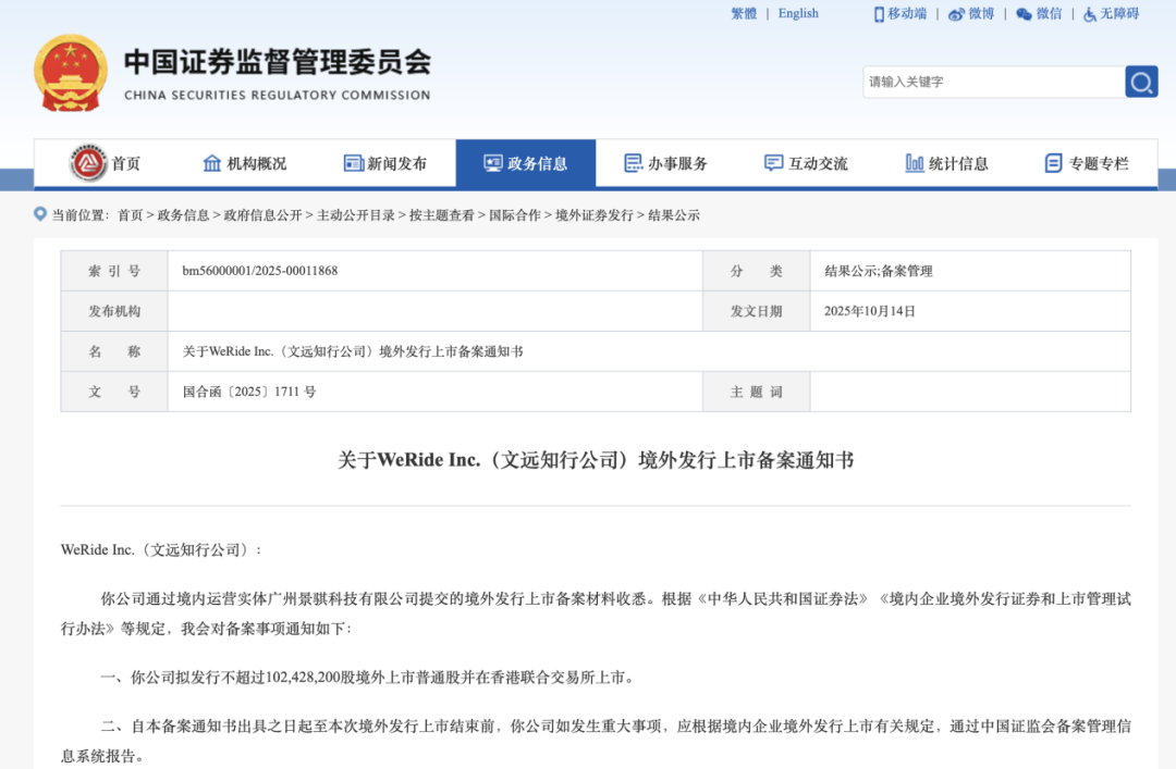 自禾赛科技实现“美股+港股”双重上市后,两大自动驾驶企业赴港IPO相继获得中国证监会备案。 10月14日,中国证监会发布关于WeRide Inc.(文远知行公司)境外发行上市备案通知书。根据备案通知书,文远知行拟发行不超过102428200股境外上市普通股并在香港联合交易所上市。 同日,中国证监会发布关于Pony AI Inc.(小马智行股份有限公司,简称“小马智行”)境外发行上市备案通知书,拟发行不超过102146500股普通股并在香港联合交易所上市。 文远知行二季度营收同比增长60.8% 根据备案通知书,文远知行完成境外发行上市后15个工作日内,应通过中国证监会备案管理信息系统报告发行上市情况。公司自本备案通知书出具之日起12个月内未完成境外发行上市,拟继续推进的,应当更新备案材料。 文远知行是一家成立于2017年的自动驾驶出行方案提供商。2024年10月,文远知行在美国纳斯达克上市。2025年9月,文远知行正式被纳入纳斯达克中国金龙指数。目前,文远知行已拥有7国自动驾驶牌照,在11个国家超30个城市开展自动驾驶研发、测试和运营。 目前,文远知行在推动全球布局方面动作频频。9月1日,文远知行旗下首批Robotaxi(自动驾驶出租车)GXR已抵达新加坡并开始测试。在上海,文远知行携手奇瑞、锦江出租获准在上海市浦东新区开展基于法规的主驾无人公开道路载人自动驾驶出行示范应用服务。9月19日,文远知行旗下自动驾驶小巴Robobus正式获得比利时联邦级别的L4级自动驾驶测试牌照。9月22日,文远知行宣布,公司将助力东南亚应用Grab,在新加坡推出面向消费者的自动驾驶出行服务——Ai.R项目。 在财务数据方面,2025年二季度,文远知行营收1.27亿元,同比增长60.8%;自动驾驶出租车业务二季度营收4590万元,同比大幅增长836.7%,创公司成立以来单季度新纪录;自动驾驶出租车业务占二季度营收比例大幅提升至36.1%,创2021年以来单季度历史新高;毛利同比增长40.6%,增速稳步提升。 ![]() 小马智行二季度总营收达1.54亿元 根据备案通知书,小马智行完成境外发行上市后15个工作日内,应通过中国证监会备案管理信息系统报告发行上市情况。公司在境外发行上市过程中应严格遵守境内外有关法律、法规和规则。小马智行自本备案通知书出具之日起12个月内未完成境外发行上市,拟继续推进的,应当更新备案材料。 2024年11月,小马智行登陆纳斯达克。今年6月,纳斯达克中国金龙指数对其成分股进行了新一轮调整,小马智行正式被纳入其中。 目前,小马智行在北京、上海、广州、深圳开展全无人Robotaxi收费运营服务,一线城市运营总面积超2000平方公里。 2025年二季报显示,小马智行Robotaxi车辆总数已突破500台,预期年底超1000台;公司二季度总营收达1.54亿元人民币(2150万美元),同比增长75.9%,环比增长53.5%。截至二季度末,现金等价物及长短理财投资为53.56亿元人民币(7.48亿美元)。 近年来,小马智行加速Robotaxi业务商业化和量产落地进程。小马智行二季度Robotaxi业务收入达1090万元人民币(150万美元),同比增长157.8%,其中来自乘客端的车费收入实现同比增长超过300%。财报分析,这一增长得益于用户覆盖范围扩大、一线城市用户需求攀升,以及Robotaxi运营车辆规模增长。 此外,在全球布局方面,9月5日,小马智行宣布与卡塔尔国家运输公司Mowasalat达成合作,共同推进自动驾驶技术和车辆在卡塔尔落地。9月20日,小马智行宣布与新加坡交通运营服务商康福德高合作,将在新加坡部署自动驾驶车辆和相关服务。9月26日,小马智行宣布获得迪拜自动驾驶路测许可。 ![]() 自动驾驶产业落地 目前,自动驾驶赛道发展如火如荼。 在政策端,近年来,政策暖风频吹,北京、上海、天津、武汉等地持续推进自动驾驶产业落地。近日,北京市市场监督管理局发布了4项自动驾驶领域地方标准,涉及智能网联汽车封闭试验场地测试、车路云一体化路侧基础设施两大核心领域,有力支撑北京市高级别自动驾驶示范区扩区建设。今年7月,上海发放新一批“智能网联汽车示范运营牌照”,首批获得授牌企业覆盖智能出行、干线物流、末端配送等场景。 在应用端,无人驾驶出租车、无人接驳、无人清扫、无人配送、干线物流等多种类型的自动驾驶应用场景示范已经陆续实现。 在自动驾驶出租车领域,一方面,文远知行、小马智行、萝卜快跑等国内头部企业已在自动驾驶出租车赛道深耕多年,运营车队规模和运营范围不断扩大,并推进商业化服务。滴滴自动驾驶、如祺出行、享道出行、Momenta等多家企业也加快在该领域的布局。另一方面,地平线、哈啰出行等自动驾驶产业链企业也切入此赛道。 “自动驾驶商业化阶段,考验的更是自动驾驶车辆的运营能力,包括遇到问题如何解决,自动驾驶系统如何持续升级,车辆补能、清洁如何规划等。”此前,小马智行相关负责人接受上证报记者采访时表示,在一线城市中,当Robotaxi投放量在1000台时,运营才会达到盈亏平衡点。 无人配送车正在从试点示范向规模化应用转变。国家邮政局数据显示,截至2024年底,快递物流无人车规模化应用已累计超过6000台,为100多个细分场景用户交付了上亿件订单。 中商产业研究院报告称,2023年全球自动驾驶市场规模约为1583亿美元,同比增长29.97%;2025年将增长至2738亿美元。 (文章来源:上海证券报) |