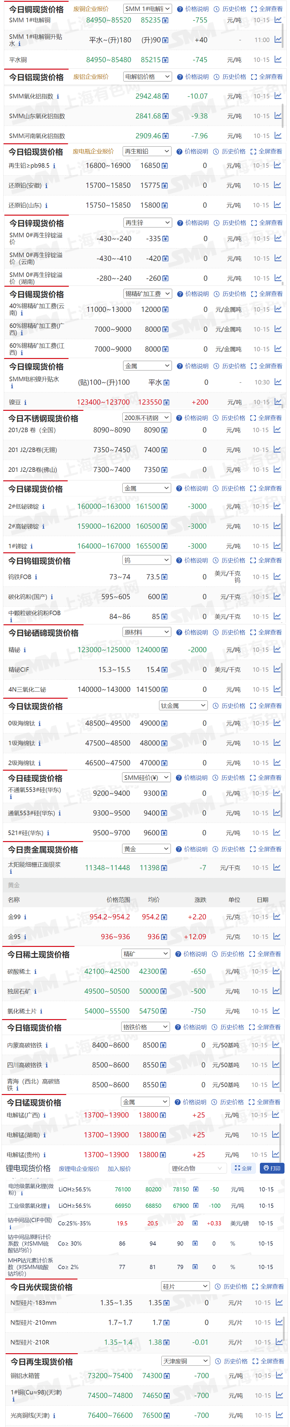 ►美元下跌 金属外强内弱 沪锌、铁矿跌逾1% 金价再创历史新高【SMM午评】 ►交割日现货交投淡静 关注交割后库存能否重新下降【SMM华南铜现货】 ►交割日现货成交活跃度低迷 市场延续冷清状态【SMM华北铜现货】 ►10月15日上海市场铜现货升贴水(第四时段)【SMM价格】 ►SMM 2025/10/15 国内知名再生铅企业废电瓶采购报价 ►天津锌:锌价大幅回落 下游点价较多【SMM午评】 ►沪锡高位回调承压震荡 供需双弱格局下静待指引【SMM锡午评】 ►【SMM镍午评】10月15日镍价维持弱势震荡,美联储可能在10月再次降息 》点击进入SMM官网查看每日报价 》订购查看SMM金属现货历史价格走势 (建议电脑端查看) |
