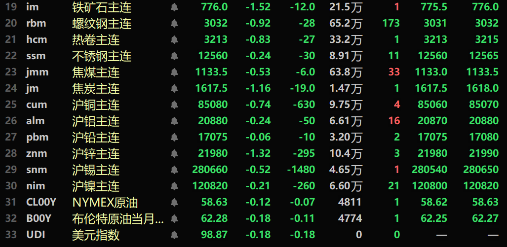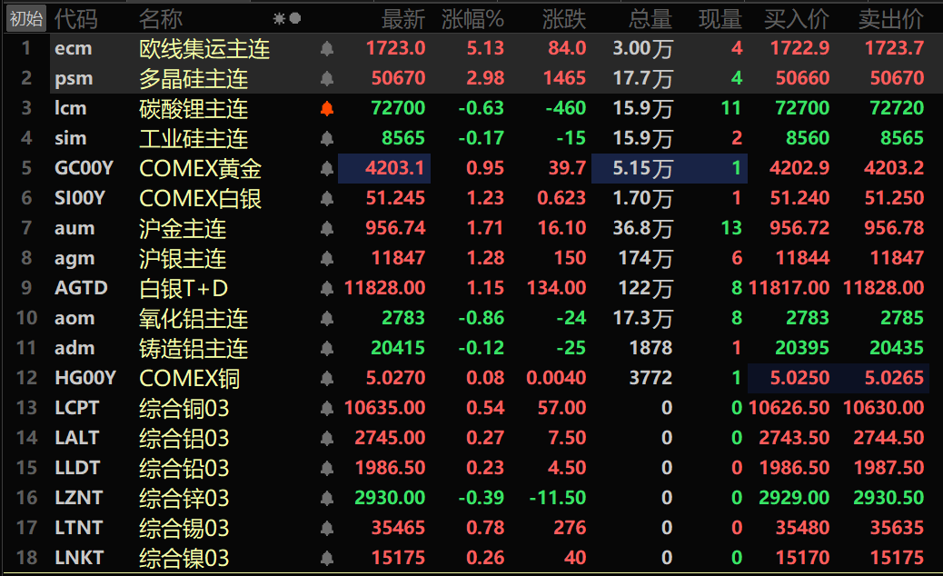 SMM10月15日讯: 金属市场方面: 截至午间收盘,内盘基本金属全线下跌,沪铜跌0.74%。沪铝跌0.24%,沪铅微跌,沪锡跌0.52%,沪镍跌0.21%,沪锌跌1.32%。 此外,铸造铝主连期货跌0.12%,氧化铝主连跌0.86%。碳酸锂主连跌0.63%,工业硅主连跌0.17%。多晶硅主连涨2.98%。 黑色系均飘绿,铁矿跌1.52%,螺纹跌0.92%,热卷跌0.83%,不锈钢跌0.24%。双焦方面:焦煤主力合约跌0.53%,焦炭主力合约跌1.16%。 外盘金属方面,截至11:45分,LME金属多上涨,伦铜涨0.54%,伦铝涨0.27%,伦锌跌0.39%,伦铅涨0.23%,伦镍涨0.26%,伦锡涨0.78%。 贵金属方面,截至11:45分,COMEX黄金涨0.95%,盘中刷新历史新高至4205.8美元/盎司;COMEX白银1.23%。内盘贵金属方面:沪金主连涨1.71%,盘中刷新历史新高至959.5元/克;沪银主连涨1.28%。 截至午间收盘,欧线集运主力合约涨5.13%,报1723点。 截至10月15日11:45分,部分期货午间行情: 》10月15日SMM金属现货价格 现货及基本面 铜:今日广东1#电解铜现货对当月合约升水10元/吨-升水70元/吨,均价升水40元/吨较上一交易日涨20元/吨;湿法铜报贴水50元/吨-贴水30元/吨,均价贴水40元/吨较上一交易日涨20元/吨。广东1#电解铜均价85215元/吨较上一交易日跌945元/吨,湿法铜均价为85135元/吨较上一交易日跌945元/吨。现货市场:今日广东库存持续上升目前已经5连涨,消费不佳是主因……》点击查看详情 宏观面 国内方面: 【国家统计局:9月CPI环比上涨0.1% PPI同比降幅继续收窄】国家统计局数据显示,2025年9月份,全国居民消费价格同比下降0.3%。其中,城市下降0.2%,农村下降0.5%;食品价格下降4.4%,非食品价格上涨0.7%;消费品价格下降0.8%,服务价格上涨0.6%。1—9月平均,全国居民消费价格比上年同期下降0.1%。9月份,全国居民消费价格环比上涨0.1%。其中,城市持平,农村上涨0.2%;食品价格上涨0.7%,非食品价格下降0.1%;消费品价格上涨0.3%,服务价格下降0.3%。国家统计局数据还显示,2025年9月份,全国工业生产者出厂价格同比下降2.3%,降幅比上月收窄0.6个百分点,环比继续持平。工业生产者购进价格同比下降3.1%,降幅比上月收窄0.9个百分点,环比上涨0.1%。1—9月平均,工业生产者出厂价格比上年同期下降2.8%,工业生产者购进价格下降3.2%。国家统计局城市司首席统计师董莉娟解读2025年9月份CPI和PPI数据。》点击查看详情 【《求是》杂志评论员:进一步稳定市场预期】,《求是》杂志评论员文章称,预期管理是宏观经济治理的重要内容,是做好经济工作的重要抓手。巩固拓展经济回升向好势头,既要注重供需平衡调控,也要注重预期管理与引导,不断提高宏观调控效能,提振社会发展信心。进一步稳定市场预期,要及时回应市场关切,增强政策可预期性。经济主体的决策高度依赖对未来政策的预期。根据形势变化及时实施精准有力的宏观政策,增强政策可预期性,是引导市场形成积极预期的关键。面对当前有人担心稳就业稳经济政策力度可能变化等问题,要及时有效回应市场关切,落实落细各项宏观政策,增强政策针对性和实效性,以政策的可靠性稳定性确保市场预期不摇摆。高度重视宏观数据与微观感受的“温差”问题,主动帮助群众和企业解决困难,让经营主体和人民群众真正有获得感,形成积极预期。随着宏观经济治理的复杂性明显上升,增强宏观政策取向一致性,防止出现“合成谬误”或“分解谬误”,是稳定市场预期的重要方面。要把握好政策实施的时机、力度、节奏,把经济政策和非经济性政策统一纳入宏观政策取向一致性评估,多出有利于稳增长、稳预期的政策,慎重出台可能产生收缩和抑制效应的政策,使政策效果更符合预期。 【国家统计局:9月金饰品和铂金饰品价格分别同比上涨42.1%和33.6%】国家统计局数据显示,9月,扣除食品和能源价格的核心CPI同比上涨1.0%,涨幅连续第5个月扩大,为近19个月以来涨幅首次回到1%。其中,扣除能源的工业消费品价格上涨1.8%,涨幅连续第5个月扩大。工业消费品中,金饰品和铂金饰品价格分别上涨42.1%和33.6%,家用器具、家庭日用杂品和通信工具价格分别上涨5.5%、3.2%和1.5%,涨幅均有扩大。 【央行公开市场今日净投放435亿元】央行今日开展435亿元7天逆回购操作,操作利率为1.40%,与此前持平。因今日无逆回购到期,当日实现净投放435亿元。 ►10月15日银行间外汇市场人民币汇率中间价为1美元对人民币7.0995元 美元方面: 截至11:45分,美元指数跌0.18%,报98.87。美联储主席鲍威尔(Jerome Powell)周二表示,美国劳动力市场依然低迷,尽管经济“可能比预期更稳健”。鲍威尔说,利率决定将在 “逐次会议”的基础上做出,在劳动力市场疲软与通胀持续高于目标之间取得平衡。市场预计本月美联储会议将降息25个基点,预计12月也会有类似的降息。 此外,国际货币基金组织(IMF)预计2025年全球经济增速将放缓至3.2%,2026年进一步降至3.1%。美国关税的急剧上升正在成为主导全球不确定性的最重要因素。(文华综合) 数据方面: 今日将公布中国9月M2货币供应年率,中国9月社会融资规模-年初至今(1015-1017几点不定),中国9月新增人民币贷款-年初至今(1015-1017几点不定),美国9月非农就业人口变动季调后(10/14-10/15),美国9月平均每小时工资年(10/14-10/15),美国9月私营企业非农就业人数变动(10/14-10/15),美国9月劳动参与率(10/14-10/15),美国9月制造业就业人口变动季调后(10/14-10/15),美国9月失业率(10/14-10/15),美国截至10月4日当周初请失业金人数(10/14-10/15),美