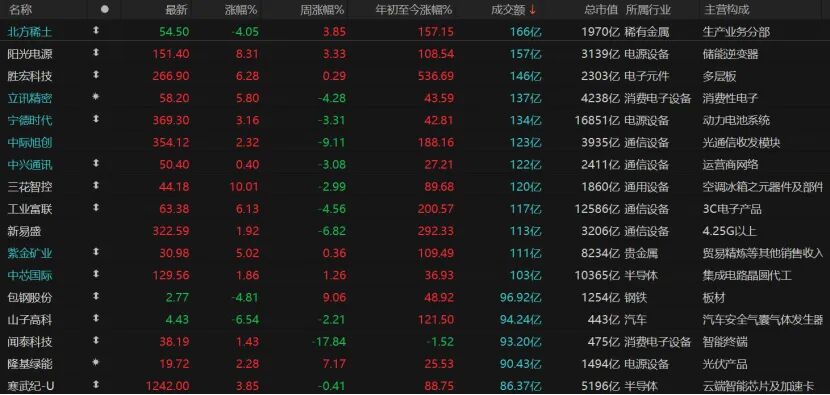 从日成交额较大的个股来看,今日仅有12只个股的日成交额超过100亿元。其中,北方稀土成交额最高,但日内下跌逾4%;阳光电源涨幅超过8%,宁德时代涨逾3%;中际旭创、新易盛均涨约2%;中芯国际涨近2%。