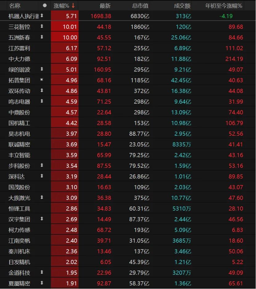 机器人执行器板块涨近6%,三花智控、五洲新春涨停。
