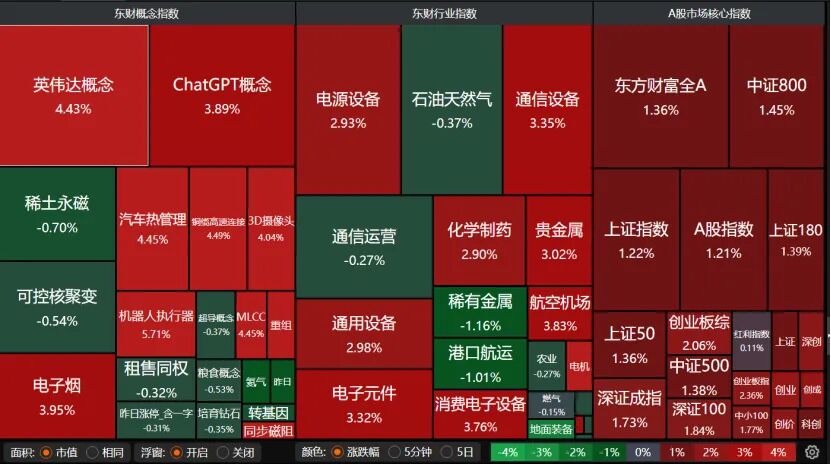 14日,传统股护盘,科技股大跌。15日,科技股强势回归。板块方面,英伟达概念、ChatGPT概念、汽车热管理、电源设备、机器人执行器、电子元件、消费电子设备、通信设备等板块表现亮眼。