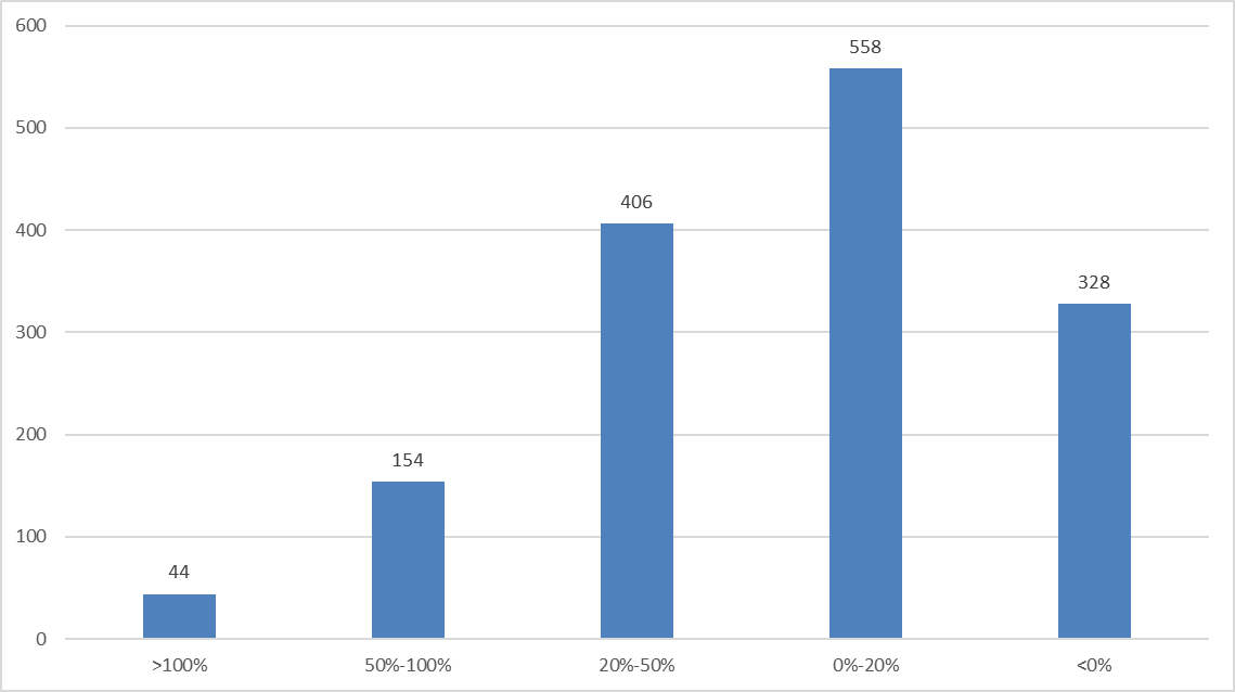 个股表现方面,Wind数据显示,截至10月15日,被私募调研的1490只个股下半年以来的股价走势分化明显。其中,有558只个股下半年以来的涨幅在0%-20%之间,406只个股涨幅在20%-50%之间,以上两个涨幅区间内的个股合计占比为64.7%。另有44只个股涨幅超过100%,154只个股涨幅在50%-100%之间,328只个股下半年以来股价出现下跌。