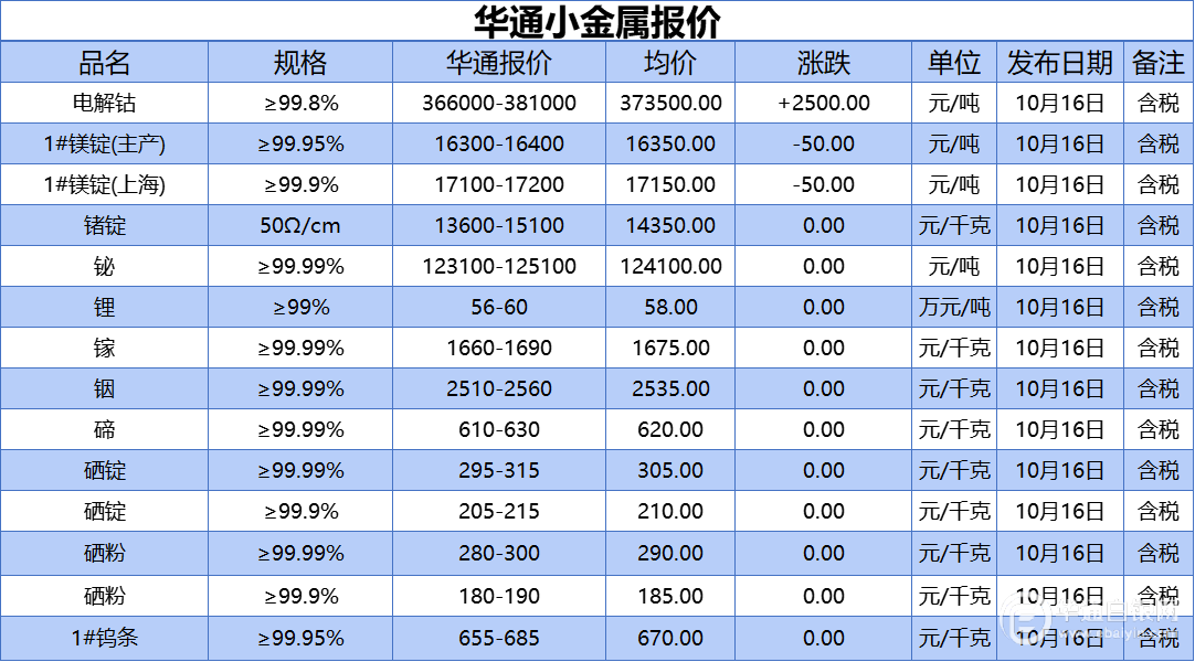 华通白银网 10月16日讯:电解钴、1#镁锭(生产)、1#镁锭(上海)、锗锭、铋、锂、镓、铟、碲、硒锭(99.99%)、硒锭(99.9%)、硒粉、硒粉(99.9%)、1#钨条报价