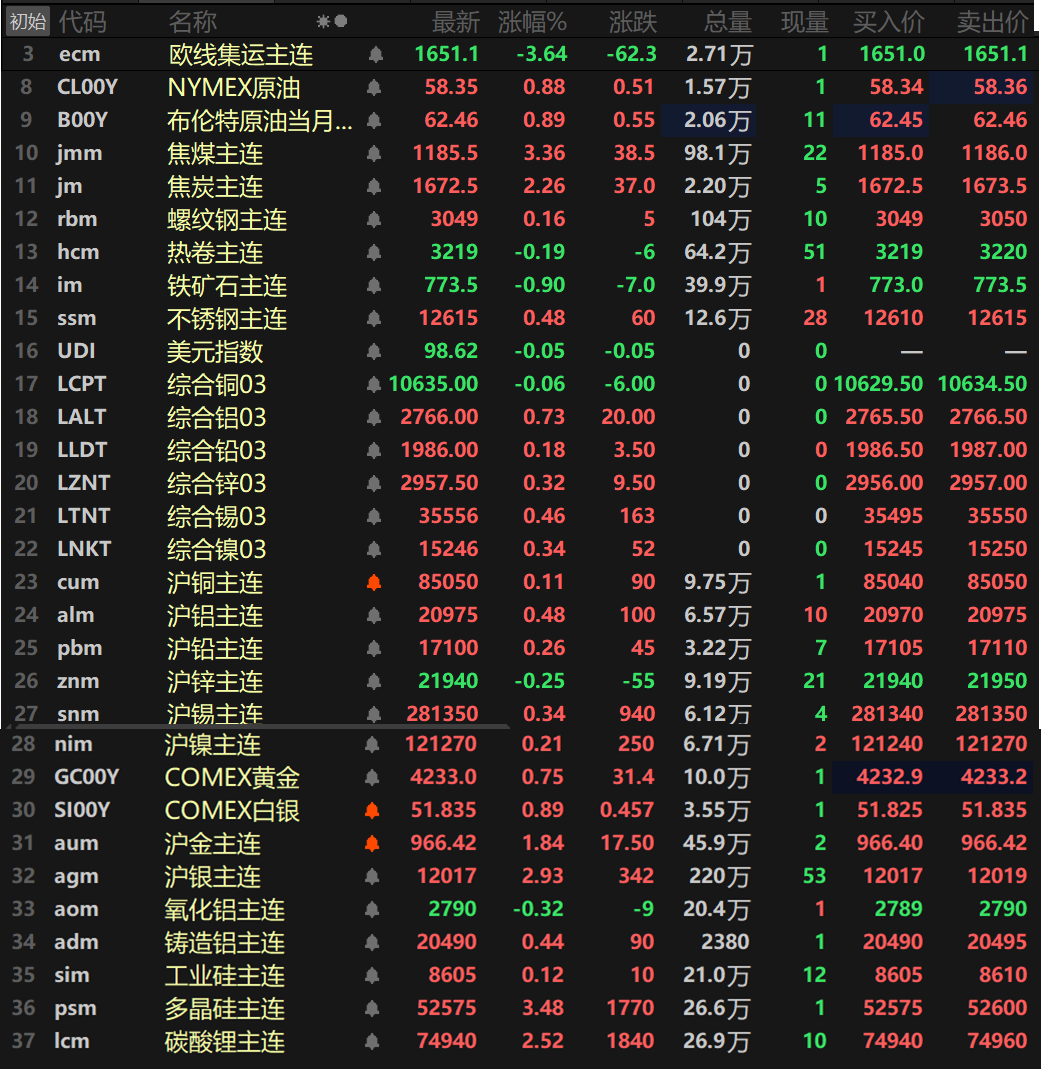 SMM 10月16日讯: 金属市场: 截至日间收盘,内盘基本金属普涨,仅沪锌唯一下跌,跌幅达0.25%,其余金属均飘红,沪铝以0.48%的涨幅领涨,其余金属涨幅波动均不大。氧化铝主连跌0.32%,铸造铝主连涨0.44%。 此外,碳酸锂主连涨2.52%,多晶硅主连涨3.48%,工业硅主连涨0.12%。欧线集运主连跌3.64%报1651.1。 黑色系方面涨跌互现,不锈钢涨0.48%,铁矿跌0.9%,热卷跌0.19%。双焦方面,焦煤涨3.36%,焦炭涨2.26%。 外盘方面,截至15:03分,外盘基本金属除了伦铜外均飘红,伦铜跌0.06%,伦铝以0.73%的涨幅领涨,其余金属涨跌幅波动均不大。 贵金属方面,截至15:03分,COMEX黄金涨0.75%,其盘中最高冲至4255.4美元/盎司,五连涨的同时续刷历史新高;COMEX白银涨0.89%,盘中最高冲至52.89美元/盎司,同样刷新其上市以来的历史新高;国内方面,沪金涨1.84%,盘中最高冲至971.58元/克,同样刷其上市以来的历史新高,录得四连涨;沪银涨2.93%,盘中最高冲至12296元/千克,同样刷新历史新高。 截至今日15:02分行情 》点击查看SMM行情看板 宏观面 国内方面: 【工业和信息化部辛国斌:编制十五五智能网联新能源汽车产业发展规划 加快组合驾驶辅助自动驾驶等标准制定】工业和信息化部副部长辛国斌今日在2025世界智能网联汽车大会上表示,作为行业主管部门,工业和信息化部将把智能网联汽车作为推进新型工业化发展新质生产力的重要力量,统筹推进技术攻关、推广应用等工作,推动产业高质量可持续发展。一是支持技术创新,推动人工智能与汽车产业深度融合,高水平建设汽车行业人工智能中试基地,支持汽车“研产供销服务”各个环节大模型的应用开发,赋能全产业数字化转型,加强新一代电子电气架构,大算力芯片、操作系统等技术攻关,加快自动驾驶技术突破。二是促进跨界融合,深入推进“车路云一体化”应用试点,通过路侧交通等信息交互,提升自动驾驶安全水平,推动城市间跨域连片移动,支持汽车、信息通讯、能源、交通等行业企业,围绕模型训练、车网互动等,共建可信数据空间,促进跨界融合发展。三是完善政策体系,编制十五五智能网联新能源汽车产业发展规划,明确发展目标,部署重点任务,加快组合驾驶辅助自动驾驶等标准制定,优化智能网联汽车生产领域管理,规范产业竞争秩序,维护公平有序市场环境。四是深化开放合作,坚持全球化发展,国际化创新,持续打造市场化、法治化、国际化一流营商环境。(财联社) 【9部门:推动以智慧多功能杆为主要载体的道路基础设施智能感知系统和城市云平台建设】住房城乡建设部办公厅等9部门近日印发《贯彻落实〈中共中央办公厅、国务院办公厅关于推进新型城市基础设施建设打造韧性城市的意见〉行动方案(2025—2027年)》,其中提出,推进车路协同设施建设。结合“车路云一体化”应用试点等工作,以需求为导向,推动以智慧多功能杆为主要载体的道路基础设施智能感知系统和城市云平台建设,支撑智能网联汽车应用,改善城市出行环境,助力提升城市数字化治理水平。 【央行公开市场今日净回笼3760亿元】央行今日开展2360亿元7天逆回购操作,操作利率为1.40%,与此前持平。因今日有6120亿元逆回购到期,当日实现净回笼3760亿元。 ►10月16日银行间外汇市场人民币汇率中间价为1美元对人民币7.0968元 美元方面: 截至15:03分,美元指数下跌0.05%报98.62。央视记者当地时间10月15日获悉,美国参议院将于16日再次就众议院通过的“干净版”政府临时拨款法案进行第十次表决。该法案需60票才能推进,但美国媒体预计其仍将遭到否决。参议院预计将于投票后休会,这意味着若临时拨款法案未得到推进,政府“停摆”可能持续至10月20日。美国两党分歧较大,此前美国官员表示政府持续停摆已经影响到美国经济,若临时拨款法案迟迟不能通过,市场不确定性将继续升温。 美联储褐皮书指出,自上一份报告以来,经济活动总体变化不大,三个地区报告经济活动略有至温和增长,五个地区报告经济活动没有变化,四个地区报告经济活动略有放缓。褐皮书表示,近几周就业水平基本稳定,各地区和行业对劳动力的需求普遍低迷。褐皮书还指出,在报告所述期间,物价进一步上涨。 市场预计,在本月的美联储会议上,几乎肯定会降息25个基点,然后在12月再降息一次。(文华综合) 宏观方面: 今日将公布中国9月全社会用电量年率-每月 (15-20日不定时)、中国9月全社会用电量-每月 (15-20日不定时),美国截至10月11日当周初请失业金人数、美国10月费城联储制造业指数、美国9月核心PPI年率、美国9月核心零售销售月率、美国9月零售销售年率、美国9月关联GDP的零售额控制组月率-季调后,澳大利亚9月季调后失业率、澳大利亚9月就业人口变动、澳大利亚9月RBA外汇交易-市场渠道,英国8月GDP月率、英国8月工业产出月率、英国8月工业产出年率、英国8月商品贸易帐-季调后、英国8月季调后贸易帐,欧元区8月季调后贸易帐等数据。 此外,商务部将召开10月第1次例行新闻发布会,美联储理事沃勒发表讲话,美联储理事巴尔就"稳定币"发表讲话,美联储理事米兰在2025年国际金融协会年会上发表讲话,美联储理事鲍曼在2025年美联储压力测试研究会议上发表线上讲话。美联储理事米兰将在野村研究论坛上发表讲话,美联储理事沃勒将就人工智能发表讲话,2025年FOMC票委、堪萨斯联储主席施密德发表讲话,欧洲央行行长拉加德参加国际货币