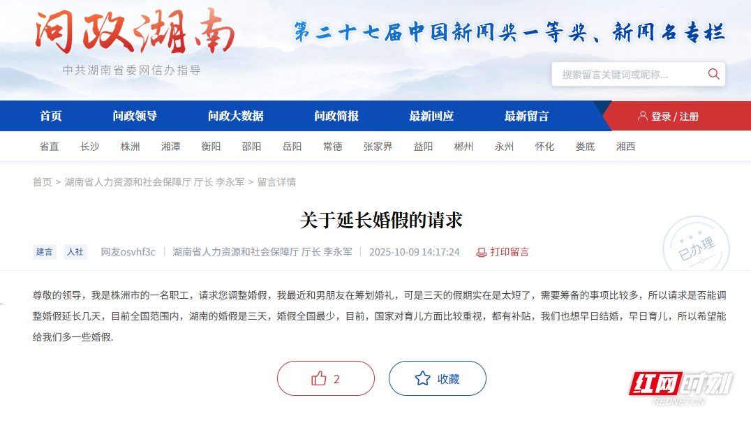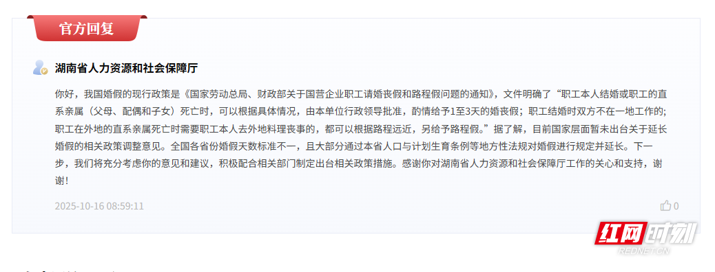 编者按:民声有呼,政必有应。红网时刻新闻客户端全新推出“时刻回ing”专栏,以“回应”践行为民初心,以“回音”彰显政务担当。专栏每日精选红网王牌栏目:《问政湖南》的铿锵回响、《百姓呼声》的热切应答、《消费维权》的责任强音,将三湘大地的“急难愁盼”化作政务服务的“行动清单”。 《问政湖南》网友的相关留言与官方回复截图。 红网时刻新闻10月16日讯(记者 陈星晓)近日,一位正与男友筹办婚礼的株洲网友在红网《问政湖南》栏目上发文,呼吁延长湖南省婚假天数。该网友在建议中指出,湖南目前仅有的三天婚假以满足婚礼筹备需要。 网友在留言中表示,三天婚假实在太短,筹备婚礼事项较多,时间十分紧张。同时,她提到国家重视育儿鼓励政策,希望湖南能通过延长婚假支持年轻人早日结婚,早日育儿,并指出湖南目前婚假天数为“全国最少”。 对此,湖南省人力资源和社会保障厅作出公开回应。回复中说明,我国目前婚假执行依据为《国家劳动总局、财政部关于国营企业职工请婚丧假和路程假问题的通知》,规定婚假为1至3天,并可据路程远近给予路程假。回应同时指出,国家层面尚未对婚假政策作出统一调整,全国各省份婚假天数标准不一,且大部分通过本省人口与计划生育条例等地方性法规对婚假进行规定并延长。 省人社厅在回应中表示,已关注到相关建议,下一步将充分考虑网友意见,积极配合相关部门研究制定政策措施。 株洲网友反映的这一问题并非个例。随着跨省、跨地域婚姻越来越普遍,婚假不足的矛盾愈发突出。 据民政部发布数据,截至2025年2月底,全国累计办理婚姻登记“跨省通办”49.2万对,可见跨省、跨地域结婚已成为一种常态。然而结婚登记可以通办,但婚礼依然面临着两头跑的压力。婚礼筹备需要大量时间,许多新人不得不面临“登记即返岗”的窘境。 其中,山西、甘肃两省的婚假最长,达到30天;江西、云南、河北、内蒙古为18天;浙江、安徽、江苏、贵州、海南为13天;北京、上海、天津、辽宁、西藏为10天。 下一期“时刻回ing”发什么?你说了算!如果您有新闻线索、民生诉求或意见建议,欢迎留言联系。 ►时刻新闻APP:下载时刻新闻APP,登录后直接留言发帖,第一时间获取民情回应。 ►红网百姓呼声平台:登录百姓呼声页面留言发帖 ►红网问政湖南平台:登录问政湖南页面留言发帖 下载时刻新闻APP 获取更多民情最新回应↓↓↓ |