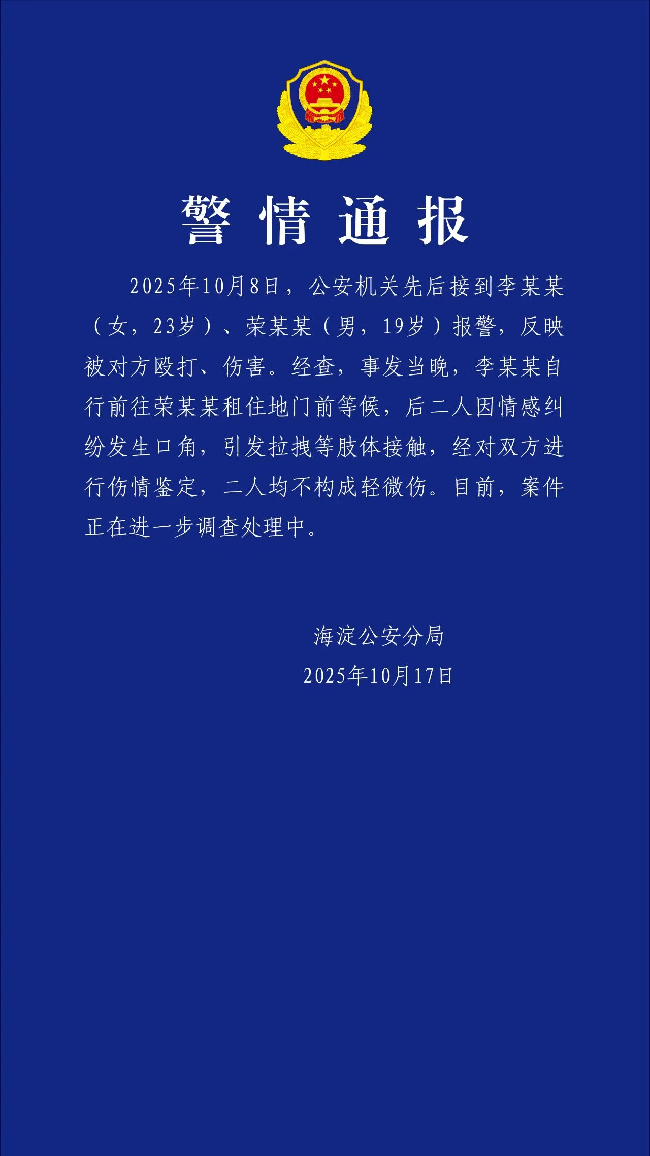 针对近日李某某、荣某某引发网络热点事件,北京海淀公安今日发布警情通报。