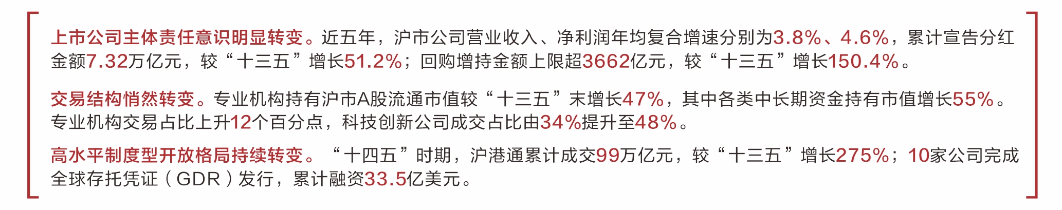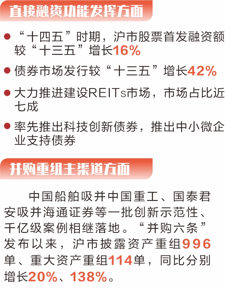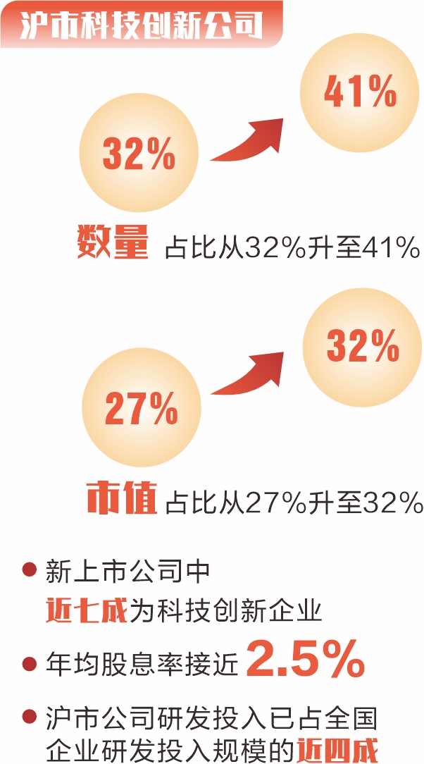证券时报记者 张淑贤 上交所“十四五”时期成绩单昨日出炉。“十四五”时期,上交所锚定高质量发展首要任务,主动融入国家经济社会发展大局,稳步推进世界一流交易所建设。目前,上交所已成为全球第三大股票市场、全球最大交易所债券市场、亚洲第二大ETF市场,期权交易量也稳居全球同类产品前列。 数据显示,“十四五”时期,沪市含“科”量不断提升,新上市公司中近七成为科技创新企业;市场韧性进一步增强,上证综指年化波动率15.9%,较“十三五”时期下降2.8个百分点;上市公司积极实施分红,沪市年均股息率接近2.5%。 “起”势: 服务新质生产力聚点成面 以设立科创板并试点注册制、全面注册制等重大改革为牵引,“十四五”时期,上交所支持高科技企业发行上市和持续发展的制度体系基本成形。五年来,沪市科技创新公司数量占比从32%升至41%,市值占比从27%升至32%。 一批技术领军企业从无到有、汇聚成势,成为国家战略重要支撑。比如,沪市集成电路、生物医药、高端装备和新能源等产业公司数量较“十三五”时期接近翻番。天风证券分析师叶慧超表示,过去,很多科技企业因无法满足盈利要求,不得不远赴海外上市。现在,科创板成为了它们在国内融资的首选平台。 “十四五”时期,上交所全力推进“科创板八条”“科创成长层1+6”等改革政策落实落地,科创板新增上市公司376家,其中37家未盈利企业,6家特殊股权架构企业,4家红筹企业,13家适用第五套标准。已有22家上市时未盈利企业在上市后实现盈利,比例超四成。20家第五套标准上市企业中19家已有核心产品上市,16家营收超1亿元,其中4家营收超10亿元。 百利天恒董事长朱义表示,“十四五”时期,百利天恒聚焦全球前沿的肿瘤治疗领域,通过自主创新构建了具有全球竞争力的核心技术平台,资本市场的支持是公司高质量发展的关键动力。 创新动能积厚成势。五年来,沪市公司研发投入从0.64万亿元升至1.07万亿元,增幅66%,已占全国企业研发投入规模的近四成。其中,科创板公司累计形成专利12万项,研发强度中位数12.6%,持续领跑A股各板块。 “承”继: 发挥市场功能见行见效 发挥好资本市场功能,既要求新求变,也要一脉相“承”。强功能、稳基础、盘存量,注重投融资协调发展,是上交所“十四五”时期工作的鲜明主线。 直接融资功能发挥方面,“十四五”时期,沪市股票首发融资额较“十三五”时期增长16%;债券市场发行总规模31万亿元,较“十三五”时期增长42%;大力推进建设REITs市场,首发上市及扩募分别达51单和4单,募集资金1405亿元,市场占比近七成;率先推出科技创新债券,累计发行1.51万亿元,惠及超400家科创企业;推出中小微企业支持债券,发行规模超197亿元,为1800余家中小微企业提供支持。 并购重组主渠道方面,上交所支持上市公司通过并购重组盘活存量、提升核心竞争力,中国船舶吸并中国重工、国泰君安吸并海通证券等一批创新示范性、千亿级案例相继落地。仅“并购六条”发布以来,沪市披露资产重组996单、重大资产重组114单,同比分别增长20%、138%。申万宏源非银金融首席分析师罗钻辉指出,并购重组加速了科技成果产业化进程,通过横向整合与产业链延伸,助力企业攻克关键核心技术。 “十四五”时期,上交所还积极落实推动中长期资金入市相关安排,大力倡导理性投资、价值投资、长期投资理念。新编指数约3500条,ETF产品规模从0.9万亿元增至4万亿元,累计增长近3.5倍,成为长期资金入市的重要渠道。推进首批科创债ETF落地,推动债券ETF市场格局破冰重塑,科创债ETF规模近1600亿元。推出覆盖中证500指数、科创50指数的ETF期权合约品种。 “转”变: 深化改革重塑发展格局 改革为发展注入澎湃动力,深化改革的步伐始终贯穿上交所“十四五”时期,推动市场格局在潜移默化中“转”变。 一是上市公司主体责任意识明显转变。近五年,沪市公司营业收入、净利润年均复合增速分别为3.8%、4.6%,累计宣告分红金额7.32万亿元,较“十三五”时期增长51.2%;回购增持金额上限超3662亿元,较“十三五”时期增长150.4%。 二是交易结构悄然转变。专业机构持有沪市A股流通市值较“十三五”时期末增长47%,其中各类中长期资金持有市值增长55%。专业机构交易占比上升12个百分点,科技创新公司成交占比由34%提升至48%。 三是高水平制度型开放格局持续转变。上交所主动融入国家对外开放大局。推动股票ETF纳入沪港通标的范围,实现沪港、中新、中巴等ETF互挂。“十四五”时期,沪港通累计成交99万亿元,较“十三五”时期增长275%;10家公司完成全球存托凭证(GDR)发行,累计融资33.5亿美元。沪市跨境指数产品规模超3200亿元,国际影响力不断提升。与中东地区实现从无到有资本市场合作,连续五年举办国际投资者大会,与千余家次境外交易所、外资机构、智库、院校等沟通合作,吸引更多国际投资者布局中国资本市场。 “随着中国资本市场不断加快对外开放步伐,外资在中国股票市场尤其是A股配置仍有明显提升空间。”中金公司研究部首席国内策略分析师李求索说。 “合”力: 强化投保共建良好生态 投资者是市场之本。凝聚各方“合”力将“大投保”理念落到实处,是“十四五”时期上交所构建良好市场生态的重要特征。 上交所坚持监管“长牙带刺”,推出新一代公司监管画像系统,从严打击投资者