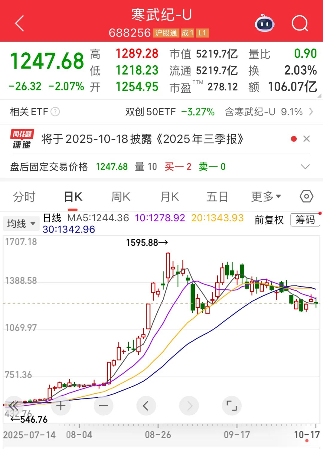 下周A股解禁市值共计717.09亿元。 寒武纪-U(688256)10月17日盘后发布前三季度业绩报告,2025年第三季度公司营收为17.27亿元,同比增长1332.52%;归母净利润为5.67亿元,同比扭亏。 公司前三季度营收为46.07亿元,同比增长2386.38%;归母净利润为16.05亿元,同比扭亏。截至第三季度,寒武纪连续四个季度实现盈利。公司称,前三季度营收增长主要是因为公司持续拓展市场,助力人工智能应用落地。 今年8月底,寒武纪-U股价一度上涨至最高价1595.88元/股,超越贵州茅台,成为A股股价最高的个股。 该股最新收盘价为1247.68元/股,市值近5220亿元,股价低于1455元/股的贵州茅台。值得注意的是,根据公司披露的数据显示,“牛散”章建平第三季度持续加仓寒武纪-U,其间持股数量增加约32万股,截至第三季度末,合计持股超过640万股,占总股本的比例为1.53%,对应最新市值达84.89亿元。截至目前,章建平已升至寒武纪第五大股东。 下周54股面临解禁 据证券时报·数据宝统计,下周将有54股解禁,按照最新收盘价计算,合计解禁市值达717.09亿元。 慧博云通下周将有1.57亿股上市流通,主要为首发原股东限售股份,解禁市值达84.28亿元。 恒帅股份的解禁规模次之,下周将有0.8亿股上市流通,解禁股主要为首发原股东限售股份,解禁市值达84.03亿元。 相比之下,蓝特光学、致欧科技、东方钽业、华通线缆等9股的解禁压力较小,解禁市值均不足千万元。 从解禁比例来看,欧圣电气、三柏硕、恒帅股份等6股的解禁比例居前,均超50%。 2只解禁股月内获得机构关注 下周将要解禁的这54只股票,10月以来股价平均下跌5.25%。海通发展、宝鼎科技、湖南白银、云煤能源的股价涨幅居前,月内均上涨超10%。 海通发展10月以来股价上涨24.12%,涨幅居首,下周将有42.6万股面临解禁,解禁市值为477.97亿元。公司目前已经发布三季度报告,前三季度营业收入30.09亿元,同比增加16.32%;归母净利润2.53元,同比减少38.47%。 股价下跌的个股中,峰岹科技、井松智能跌幅居前;其中井松智能的跌幅最大,10月以来累计下跌22.73%,公司下周将有55.93万股面临解禁,解禁规模为0.14亿元。 下周解禁股中,北汽蓝谷、康尼机电10月以来获得机构调研。北汽蓝谷月内获得11家机构调研,公司表示,公司与小马智行合作的Robotaxi车型目前已完成开发测试工作,于2025年7月开启北汽极狐阿尔法T5Robotaxi量产,计划2025年下半年车辆上市。 康尼机电10月以来获得3家机构调研,公司表示,近年,轨道交通海外市场保持稳定增长,海外市场作为公司战略重点拓展的方向,产品已从车门拓展到安全门、内装等领域。公司将继续全力促进海外订单和收入保持稳定增长,使其成为公司新的经济增长点。 一般而言,解禁的利空影响对于业绩亏损或下滑的个股要显著大于绩优股。下周面临解禁的个股中,北汽蓝谷、迪哲医药-U、绿盟科技、云煤能源等15股上半年业绩为亏损状态。 ✅ 关键节点划重点与仓位管理分析 ✅ 互动答疑:在线解答您的困惑 |