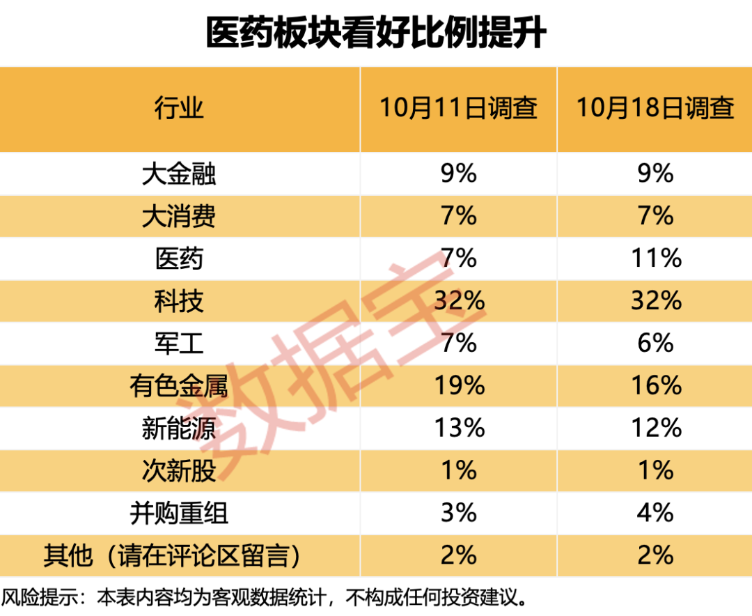 最新调查显示,看好医药板块的投资者比例明显提升。
