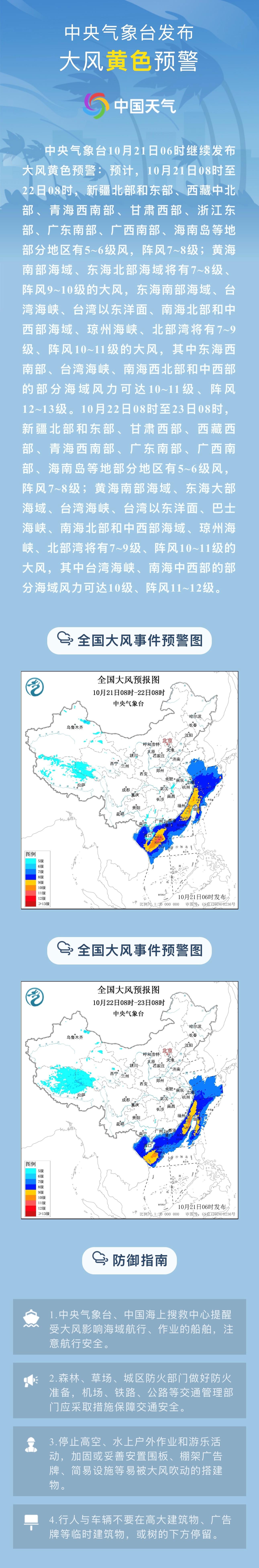 10月21日6时,中央气象台继续发布台风、大风黄色预警: 台风黄色预警:“风神”将掠过西沙群岛 海南台湾局地有大暴雨 今年第24号台风“风神”(强热带风暴级)的中心今天(21日)早晨5点钟位于海南省三沙市(西沙永兴岛)北偏东方向大约180公里的南海西北部海面上,就是北纬18.3度、东经113.1度,中心附近最大风力有10级(25米/秒),中心最低气压为985百帕,七级风圈半径260~400公里。 预计,“风神”将以每小时15公里左右的速度向西偏南方向移动,强度还将有所增强,最强可达强热带风暴级或台风级(28~33米/秒,10~12级);今天下午至夜间掠过西沙群岛,之后趋向越南中部沿海,强度逐渐减弱。 大风黄色预警:新疆广东海南等8省区部分地区有大风 部分海域风力达10~11级 预计,10月21日8时至22日8时,