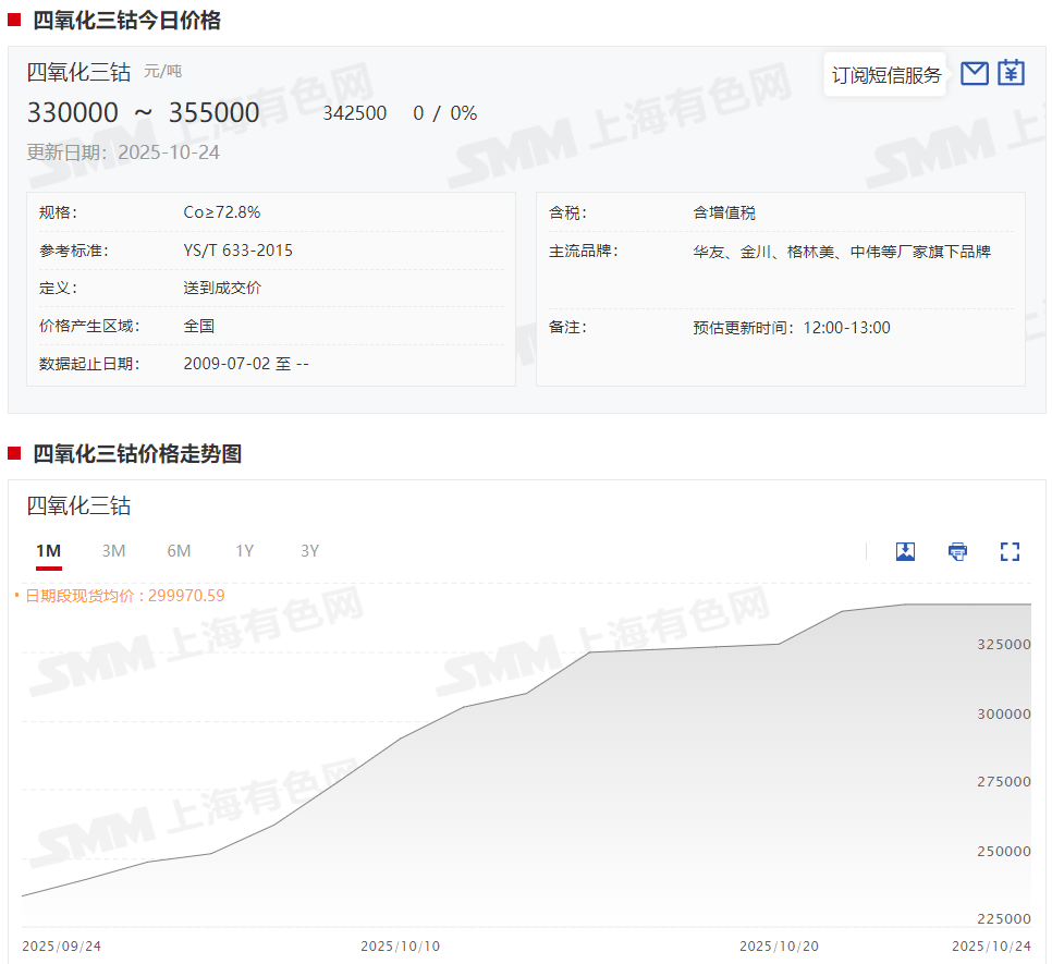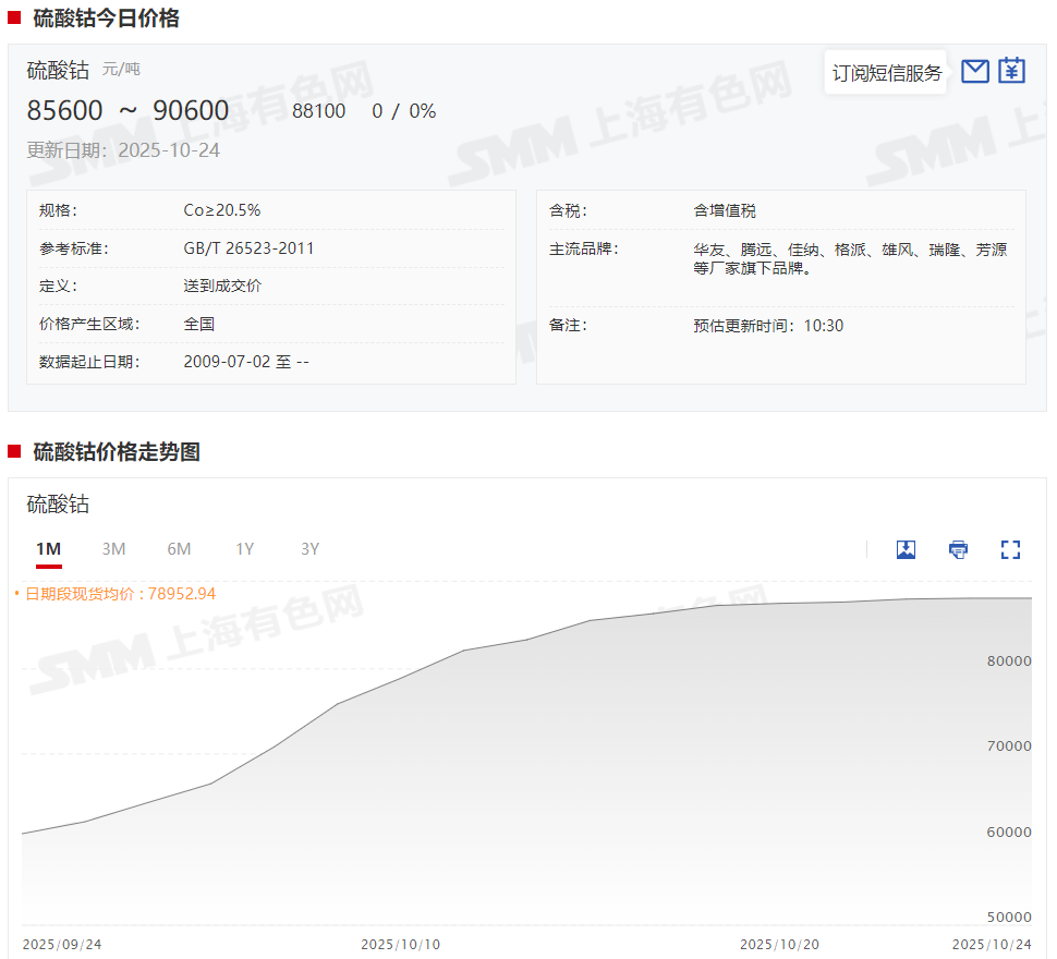 》查看SMM钴锂现货报价 据SMM了解,从实际供需结构来看,本周电解钴市场基本面变化有限。供应方面,冶炼企业受原料库存偏紧影响,继续暂停报价;贸易商虽跟随盘面上调现货报价,但由于周初钴价上涨过快,成交表现清淡。为促进实际成交,部分贸易商将报价基准从前期的轻微升水逐步下调至平水甚至小幅贴水状态; 需求方面,下游企业仍以刚需采购为主,整体成交未出现明显放量。针对本周后半周市场价格出现回调的现象,除资金行为影响外,分析认为主要受三方面因素驱动:一是电解钴价格上行后,反融为钴盐的利润空间收窄,冶炼企业采购意愿降低;二是海外电解钴价格虽维持高位,但对国内过高价格的承接能力有限;三是市场中存在部分不带票的低价货源流通,对主流价格形成压制。 整体来看,在本轮价格上涨后,电解钴与钴盐之间价差再度拉大。考虑到电解钴可作为原料反融为钴盐,预计其价格将逐步向钴盐反融成本线靠拢,以实现价差合理化回归。 钴盐方面(硫酸钴及氯化钴): 硫酸钴: 据SMM现货报价显示,本周硫酸钴现货报价也呈现接连上涨的态势,不过涨势相较前几周已经明显减缓,在10月24日终于“歇了一口气”,报85600~90600元/吨,均价报88100元/吨,较10月17日上涨850元/吨,涨幅达0.97%。