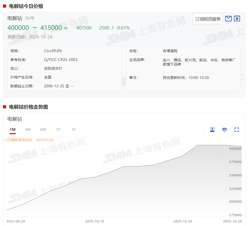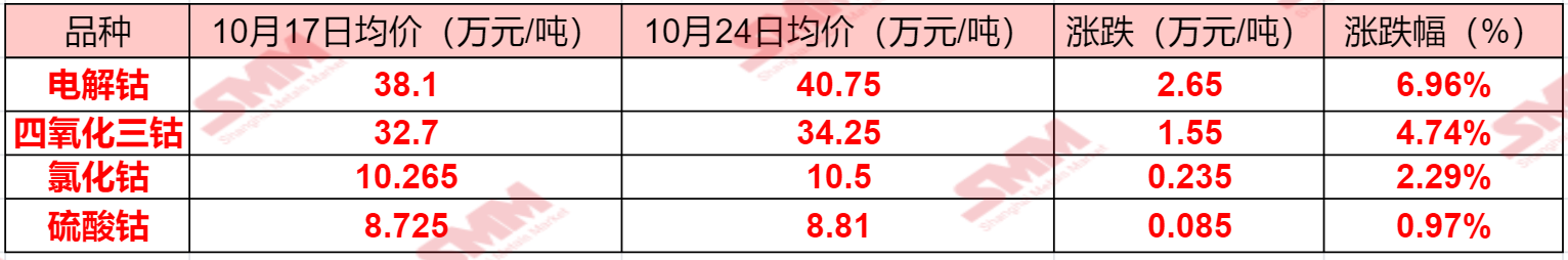 SMM 10月24日讯:本周钴系产品现货报价变动相较前几个周明显放缓,仅电解钴波动较为剧烈,10月21日甚至单日跳涨2万元/吨,不过在10月24日,其价格却又出现了久违的小幅下调,出现此情况的原因几何?SMM整理了本周钴系产品现货报价的变动情况,具体如下: