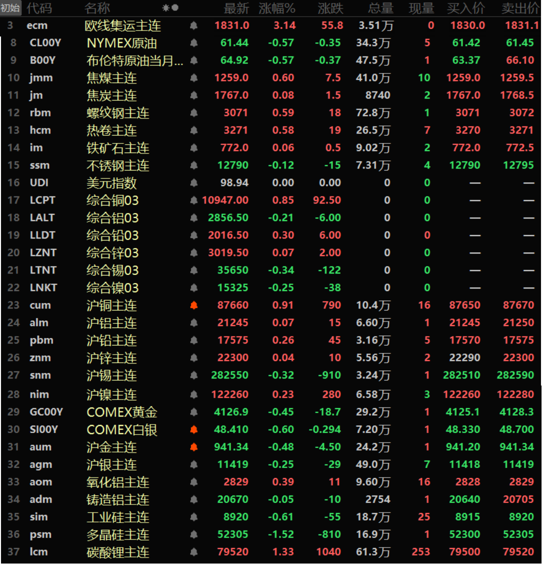SMM10月25日讯: 金属市场方面: 隔夜内外盘金属涨跌互现,沪铜以0.91%的涨幅领涨,录得六连阳。伦铜涨0.85%,其余金属涨跌幅波动均不大。氧化铝主连涨0.39%,铸造铝主连跌0.05%。 隔夜黑色系方面除不锈钢外均飘红,不锈钢跌0.12%,螺纹、热卷一同涨逾0.5%,螺纹涨0.59%,热卷涨0.58%。双焦方面,焦煤涨0.6%,焦炭涨0.08%。 隔夜贵金属方面,COMEX黄金跌0.45%,周线下跌2.05%,结束了此前九周连涨的态势。COMEX白银跌0.6%,周线下跌3.38%。国内方面,沪金跌0.48%,周线下跌4.89%,沪银跌0.25%,周线大跌7.34%。 截至10月25日8:22分,隔夜收盘行情