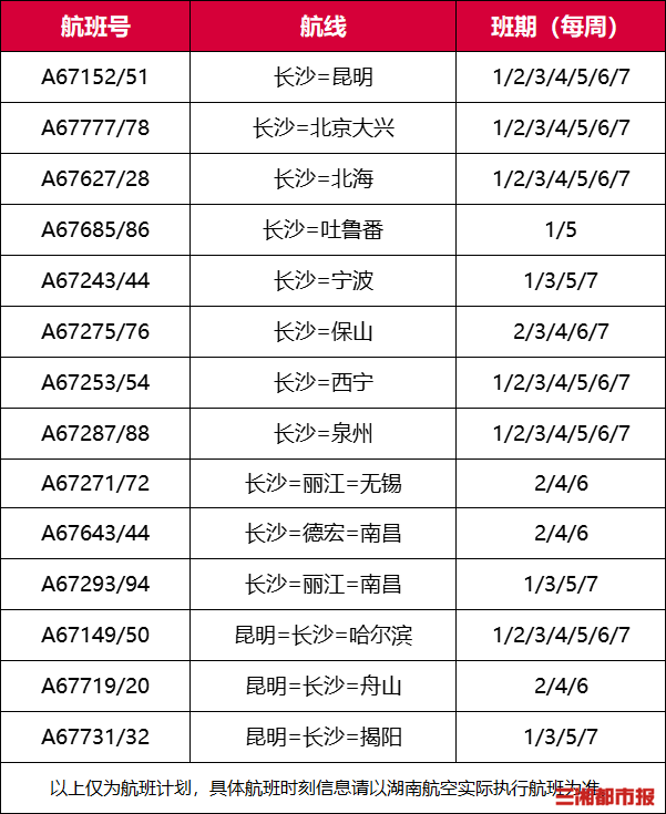 此外,湖南航空计划恢复多条热门航线,如昆明—长沙—哈尔滨、长沙—宁波、长沙—泉州、无锡—沈阳等多条航线,满足广大旅客的出行需求。 在湖南本地市场,湖南航空新航季持续加强在湘航线网络布局。2025年冬航季,长沙地区进出港航线将达14条,涵盖长沙—昆明、长沙—北京大兴、长沙—北海、长沙—吐鲁番、长沙—宁波、长沙—保山、长沙—西宁、长沙—泉州、长沙—丽江—无锡、长沙—德宏—南昌、长沙—丽江—南昌、昆明—长沙—舟山、昆明—长沙—哈尔滨、昆明—长沙—揭阳等航线。