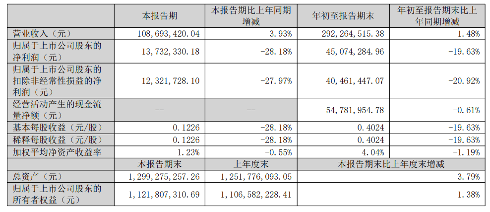 星源卓镁10月23日公告,2025年前三季度公司实现营业收入2.92亿元,同比增长1.48%;归属于上市公司股东的净利润0.45亿元,同比下降19.63%。基本每股收益0.40元,同比下降19.63%。