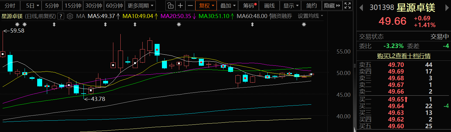 二级市场方面,星源卓镁10月27日的股价延续前一个交易日的涨势继续出现上涨,截至27日14:15分,星源卓镁涨1.41%,报49.66元/股。 |