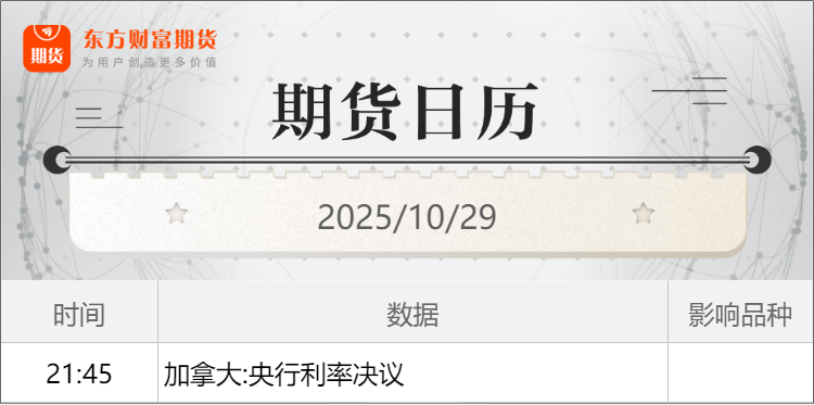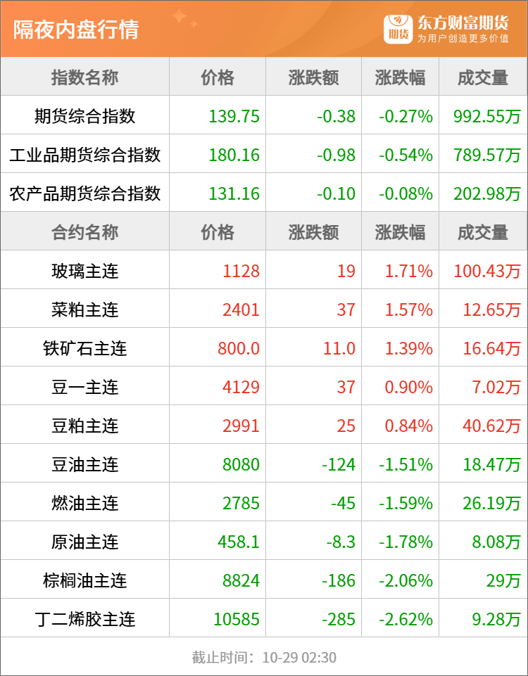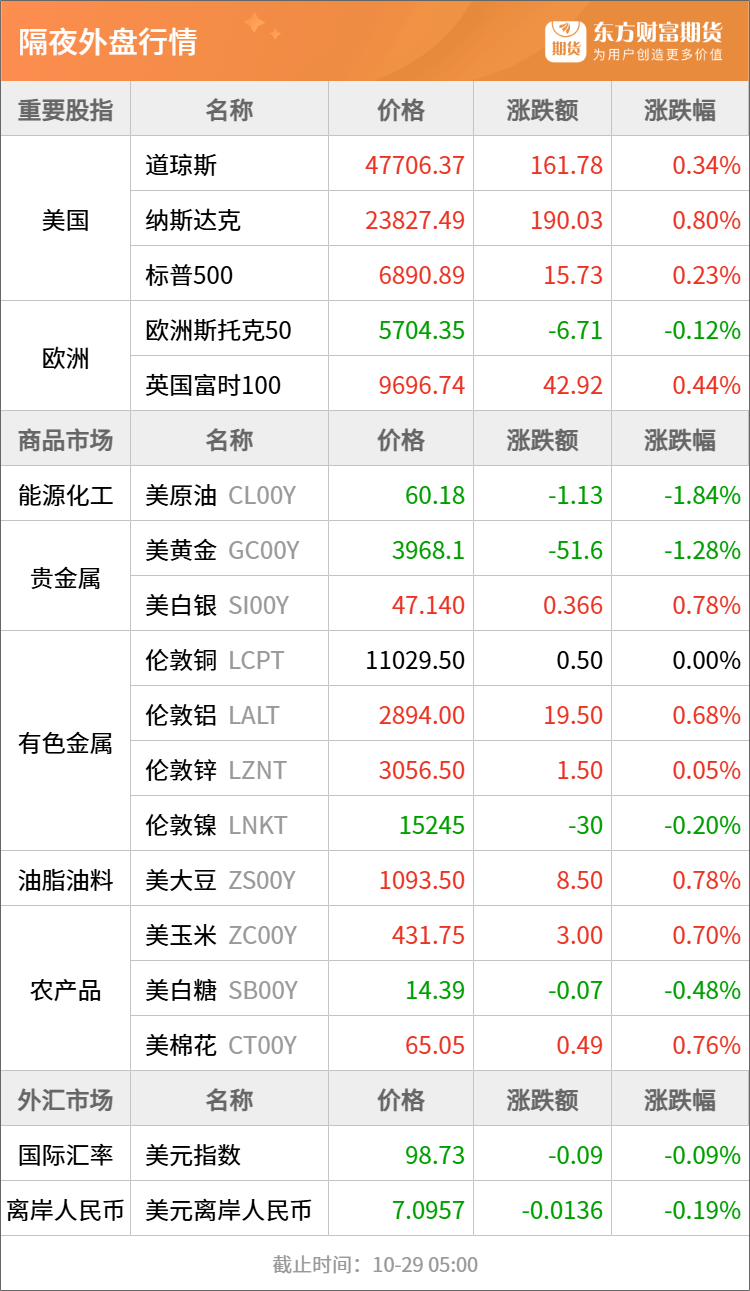 隔夜行情![]() ![]() 每日精选黄金突然直线下跌!多品牌金饰克价跌破1200元!发生了什么?机构分析 10月焦炭价格偏强运行 但11月持续涨价难度较大 铜铝齐飞!当贵金属黯然失色时 工业金属的“冲锋号”依然嘹亮 宏观产经新华社:中共中央关于制定国民经济和社会发展第十五个五年规划的建议发布。其中指出,实施产业创新工程,一体推进创新设施建设、技术研究开发、产品迭代升级,加快新能源、新材料、航空航天、低空经济等战略性新兴产业集群发展。前瞻布局未来产业,探索多元技术路线、典型应用场景、可行商业模式、市场监管规则,推动量子科技、生物制造、氢能和核聚变能、脑机接口、具身智能、第六代移动通信等成为新的经济增长点。 财联社:10月28日,《中共中央关于制定国民经济和社会发展第十五个五年规划的建议》全文发布。针对资本市场,十五五规划建议要求建立健全功能完善的资本市场。具体包括:“提高资本市场制度包容性、适应性,健全投资和融资相协调的资本市场功能。积极发展股权、债券等直接融资,稳步发展期货、衍生品和资产证券化。” 中国人大网:国务院关于金融工作情况的报告发布,其中提到下一步工作将考虑落实落细适度宽松的货币政策;进一步加强和完善金融监管;突出金融服务实体经济;重点方向持续深化金融供给侧结构性改革;推进金融高水平双向开放;防范化解重点领域金融风险这六大方面,并且研究储备新的政策举措,巩固资本市场向好势头。 品种资讯黑色系期货 铁矿石:近日几内亚政府与战略合作伙伴力拓SimFer、宝武和赢联盟西芒杜通过西芒杜战略委员会签署了西芒杜铁矿项目海运相关的合同文件,这为项目按计划在2025年底前实现首船铁矿石发运奠定了坚实基础。(我的钢铁网) 钢材:为缓解四季度销售压力,稳定钢材价格,华东某钢厂将于11月-12月期间减少钢材产量8万吨(预计影响铬铁需求量1.04万吨左右),减产产品将以200系不锈钢为主,主要影响热轧产量。同时,为配合减量优化工作,该钢厂计划在12月份安排产线集中检修,涉及高炉、炼钢、热轧、酸洗产线,具体检修时间根据市场实际情况另行确定。(我的钢铁网) 农产品期货 生猪:据农业农村部监测,截至10月28日14:00时,全国农产品批发市场猪肉平均价格为18.03元/公斤,比昨天上升0.4%;鸡蛋7.39元/公斤,与昨天持平。(农业农村部) 棕榈油:据印尼棕榈油协会,印尼8月棕榈油(包括精炼棕榈油)出口量为347万吨;同时受有利天气影响,印尼2025年棕榈油产量预计增长10%。(财联社) 中国粮油商务网监测数据显示,截止到2025年第43周末,国内棕榈油库存总量为56.5万吨,较上周的54.9万吨增加1.6万吨;合同量为3.7万吨,较上周的4.0万吨减少0.3万吨。(中国粮油商务网) 大豆:农业农村部发文称,前三季度农业农村经济运行总体平稳,全年粮食有望再获丰收。夏粮稳产丰收,产量2994.8亿斤。大豆油料扩种成果持续巩固,预计大豆面积连续4年保持在1.5亿亩以上,产量继续保持在2000万吨以上;夏油面积、单产、总产实现“三增”。(财联社) 有色/贵金属期货 贵金属:花旗银行下调黄金和白银的短期价格目标,将0至3个月黄金价格预测从每盎司4000美元下调至3800美元,白银价格预测从每盎司55美元下调至42美元,理由是全球市场环境发生变化。(新华财经) 沪铅:据悉,华北地区某大型再生铅炼厂近日大炉停产检修,复产日期待定,影响精铅产量300-400吨/天。(上海有色网) 氧化铝:截至2025年10月28日,西澳FOB氧化铝价格为319美元/吨,海运费23.15美元/吨,美元/人民币汇率卖出价在7.12附近,该价格折合国内主流港口对外售价约2837.60元/吨左右,低于SMM氧化铝指数价格45.32元/吨,进口窗口维持开启状态。(上海有色网) 能化期货 原油:路透援引印度政府消息人士称,印度企业将不会购买由贸易商供应的俄罗斯石油公司和卢克石油的原油。很难预测企业何时会下新的俄罗斯石油订单。(新华财经) 尿素:10月28日山东地区尿素行情暂时稳定,小颗粒主流出厂成交1560-1600元/吨,大颗粒出厂成交1750-1780元/吨。临沂市场一手贸易商出货参考价格1610元/吨附近,菏泽市场参考价格1580元/吨附近。日月装置预计月底恢复,省内其它企业基本正常。(隆众资讯) 烧碱:10月28日山东液碱市场表现依旧疲软,依然有个别企业价格继续下调,月底多数企业库存增加,走货显疲软。鲁西南32%离子膜碱主流成交790-830;鲁中东部32%离子膜碱主流成交750-810,50%离子膜碱主流成交1210-1330;鲁北地区32%离子膜碱主流成交790-860;鲁南32%离子膜碱主流成交830-880。(单位:元/吨)(隆众资讯) 沥青:最新数据显示,截止到10月27日,国内沥青104家社会库库存共计131.2万吨,较10月23日减少4.1%。本周期国内各大区社会库多数下行,其中山东地区社会库去库较为明显,主要得益于天气条件改善后下游需求逐步释放,市场参与者出货意愿增强,推动库存水平进一步降低。(隆众资讯) 环球视野央视新闻:当地时间10月28日,俄罗斯总统新闻秘书佩斯科夫就与乌克兰重启谈判的可能性发表评论时指出,目前俄方无法评估重启谈判的前景,正如此前俄方多次强调的,谈判暂停的根本原因在于乌方缺乏继续对话的意愿。 财联社:特朗普重申对美联储主席鲍威尔的批评,称鲍威尔将在“几个月”后下台。 财联社:ADP公布截至10月11日四周的初步就业岗位估算,初步估计美国平均增加14,250个就业岗位。