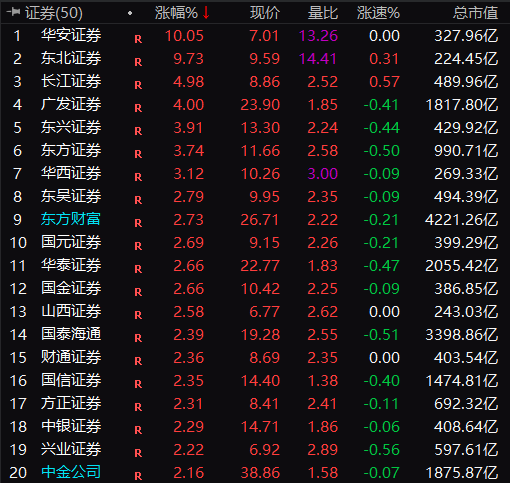 关键时刻,“牛市旗手”崛起。 今日(10月29日)盘中,A股“牛市旗手”券商股集体爆发,华安证券强势涨停,东北证券触及涨停。有分析指出,券商股的表现强劲主要受三季度业绩超预期推动。另外,沪指突破4000点大关带动市场情绪回暖,也是券商股走强的原因之一。 受券商股走强带动,沪指成功站上4000点大关,截至午间收盘,沪指涨0.37%,报4002.83点;创业板指数大涨超1%。对于A股后市,国内券商与外资机构的展望都较为乐观,中国资产价值重估、科技叙事明晰,将持续推动全球资本增配,中国股市有望步入更具持续性的上行趋势。 “牛市旗手”爆发 10月29日盘中,A股券商股集体拉升,华安证券强势涨停,截至午间收盘,东北证券大涨9.7%,长江证券、广发证券涨超4%,东方证券、东兴证券、华西证券涨超3%,东方财富、国元证券、国金证券、华泰证券、山西证券、国泰海通等券商股涨超2%。
