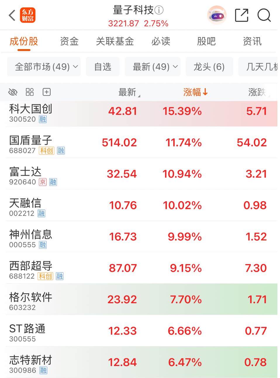 超级赛道突然爆发。 今日(10月29日)早盘,A股量子科技概念股集体走强,神州信息、天融信直线涨停,科大国创、国盾量子均大涨超10%。消息面上,英伟达推出NVQLink,为17家量子计算公司和9家科研实验室连接量子与GPU计算。 与此同时,国内量子科技赛道再次迎来重磅政策利好。10月28日,中共中央关于制定国民经济和社会发展第十五个五年规划的建议发布,其中指出,推动量子科技、生物制造、氢能和核聚变能、脑机接口、具身智能、第六代移动通信等成为新的经济增长点。 有券商机构指出,当前,量子科技产业正处于技术突破、应用探索、产业培养同步推进的关键期,量子计算、量子通信及量子精密测量的商业化均有所加速。 突然爆发 10月29日,A股开盘后,量子科技概念股全线爆发,神州信息、天融信直线涨停,科大国创、国盾量子、富士达大涨超10%,西部超导、志特新材、禾信仪器、吉大正元、格尔软件等个股跟涨。