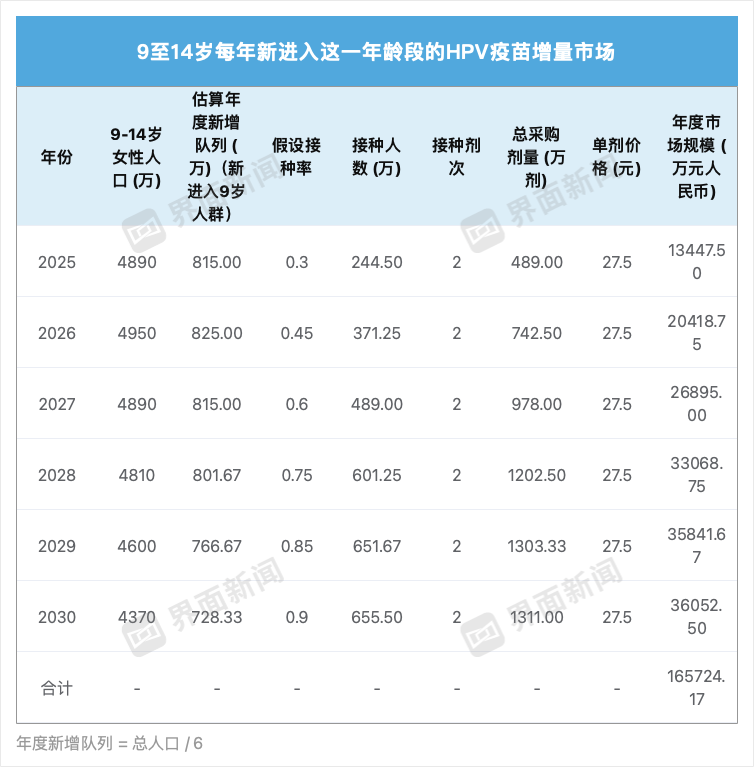 9月11日,国家卫健委副主任、国家疾控局局长沈洪兵在新闻发布会上表示,今年国家将推出面向适龄女生的HPV疫苗(宫颈癌疫苗)接种服务,并且将HPV疫苗纳入国家免疫规划,保护女性的健康。这是18年来国家免疫规划首次扩容。 而此次采购价27.5元大概率也是二价HPV疫苗的地板价。 国家免疫规划市场主要由两部分组成:一是针对9至14岁适龄女生的存量市场,二是每年新进入这一年龄段的增量市场。 据国信证券预测,2025年至2030年间,中国9至14岁女性人口预计分别为4890万、4950万、4890万、4810万、4600万和4370万。 二价HPV疫苗以固定至2剂次进行接种。据世界卫生组织(WHO)发布的《加速消除宫颈癌全球战略》,目标系90%的女孩在15岁前完成HPV疫苗接种。中国也积极支持WHO在2030年前90%的女孩在15周岁之前完成HPV疫苗全程接种的目标。即,以90%作为最终接种率。 对于这种由政策推动、接种对象明确的公共卫生市场,目标人群渗透率模型是最合适的预测方法。 以每年新增的9岁女生为基础进行测算,界面新闻预测2025年至2030年期间的增量市场规模累计约16亿元人民币。