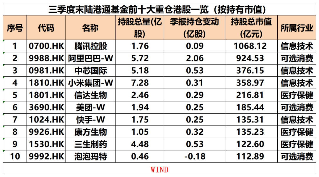 2025年前三季度,港股市场大反攻,恒生指数领跑全球主要指数。与此同时,港股获公募大举增持,涉及可选消费、信息技术、医疗保健等领域,腾讯控股、阿里巴巴-W、中芯国际、小米集团-W等成为陆港通基金重仓股。 多位业内人士表示,未来,港股科技股的结构性行情有望延续,AI、半导体、云计算等子行业将保持增长势头。关注互联网、人工智能、医药、消费等细分行业。 港股基金大举加仓 Wind数据显示,在3000多只陆港通基金(只统计初始份额)中含“港”字的主动权益基金超150只,这些都是“高纯度”以港股为投资方向的基金。截至今年三季度末,这些基金的港股平均仓位为65%,和二季度末基本持平,处于中性偏上位置。其中,八成以上港股仓位的基金占比近五成。 今年前三季度,港股市场强势反攻,恒生指数累计涨幅超33%,领跑全球主要指数,AI、创新药板块轮番演绎。 与此同时,不少基金经理在三季度不同程度加大了对港股的投资力度。比如,张弘管理的华泰柏瑞港股通医疗精选A,港股仓位由今年二季度末的72.65%提升至今年三季度末的94.50%,环比增长超21个百分点。 天弘港股通精选A、中航恒宇港股通价值优选A、南方港股医药行业A等多只港股主题基金港股仓位均有超10个百分点增长,截至三季度末,这些基金的港股仓位均在90%~97%不等。 按照持有市值统计,截至三季度末,被陆港通基金重仓的前十大港股分别为腾讯控股、阿里巴巴-W、中芯国际、小米集团-W、信达生物、美团-W、快手-W、康方生物、三生制药、泡泡玛特,涵盖可选消费、信息技术、医疗保健等领域。其中,仅泡泡玛特遭陆港通基金减持。