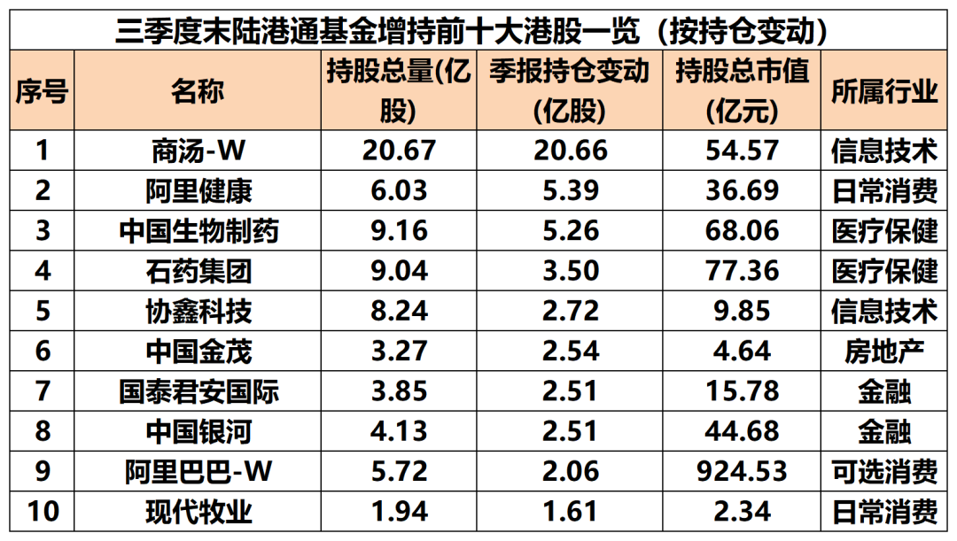 按照持股变动情况排序,截至三季度末,加仓幅度最大的前十只港股为商汤-W、阿里健康、中国生物制药、石药集团、协鑫科技、中国金茂、国泰君安国际、中国银河、阿里巴巴-W、现代牧业,涉及信息技术、日常消费、医疗保健、房地产、金融等领域。