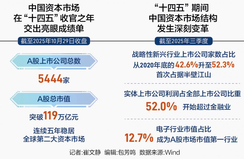 中国资本市场在“十四五”收官之年交出亮眼成绩单:截至2025年10月29日收盘,A股上市公司总数达5444家,总市值突破119万亿元,“十四五”期间连续五年稳居全球第二大资本市场。 这一里程碑式的成就,为10月27日证监会主席吴清在2025金融街论坛年会上阐述的“十五五”资本市场改革路线图提供了坚实注脚。他强调将以投融资综合改革为牵引,推动市场实现更深层次变革。 五年来,上市公司作为实体经济“基本盘”的地位更加巩固——营业收入占GDP比重从“十三五”时期的52.0%攀升至58.3%,实体上市公司利润总额占规模以上工业企业利润总额的比重由35.5%提升至49.0%。 更为深刻的是结构性质变:科技产业市值占比逼近五成,电子行业超越银行业成为A股第一大行业,资本市场与实体经济正形成更紧密的共生关系。 吴清在2025金融街论坛年会上指出,“在全球格局与科技创新深刻变化的今天,唯有不失时机深化改革,才能在不确定的环境中赢得主动与未来”。业内人士认为,“十四五”期间上市公司在规模、结构和质量上的全面提升,为即将开启的“十五五”时期资本市场改革奠定了坚实基础。