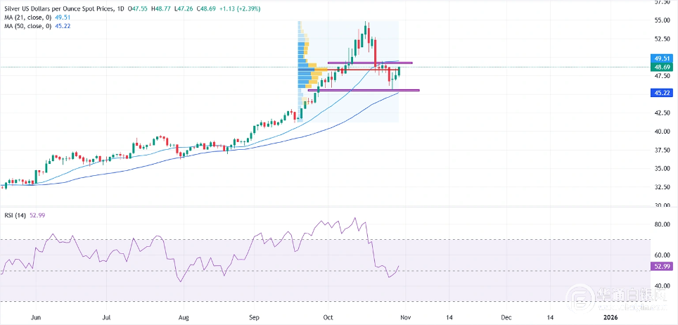| 【华通白银网10月31日讯】•在空头回补和技术买入兴趣的支撑下,白银延续了反弹。 •与中美贸易相关的风险情绪改善可能会打压避险需求,并限制白银的进一步上涨。 •技术方面,白银在49.00-49.50美元附近面临强劲阻力,21日移动均线继续限制涨幅。 周四,白银延续了连续第三个交易日的复苏势头,接近48.70美元,当日上涨近2.40%,在45.00-46.00美元需求区域的坚守初现成效,多头资金正重返白银市场。 在此之前,金价曾大幅回调,从本月早些时候的历史高点54.86美元跌至一个月低点45.56美元,跌幅近16%,之后稳定在50日均线上方。 最近的上涨似乎更多地受到技术买盘的推动,而非新的基本面催化剂,因为与中美贸易相关的风险情绪有所改善,限制了对贵金属的避险需求。 然而,美联储周三宣布降息,给市场带来了一些支撑,但市场将其解读为鹰派降息,因为美联储主席鲍威尔表示,“在12月会议上进一步降息并非板上钉钉的事情”,暗示不太可能进一步放松政策。