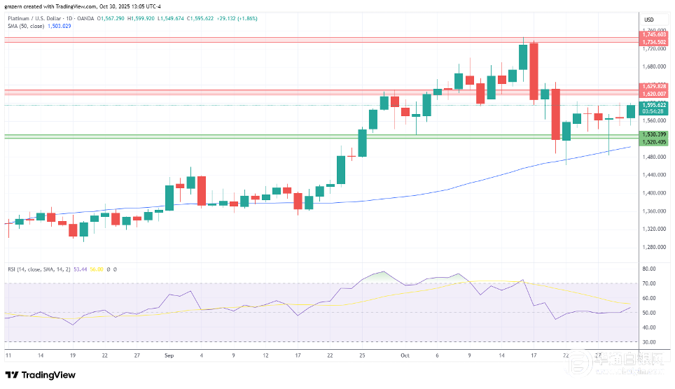 随着金银比下降至82.00,白银上涨2.5%。相对强弱指标保持在中等水平,近期有足够的空间获得动力。 如果成功测试49.60美元至49.80美元的阻力位,则将推动白银向下一个阻力位51.10美元至51.30美元前进。 铂金