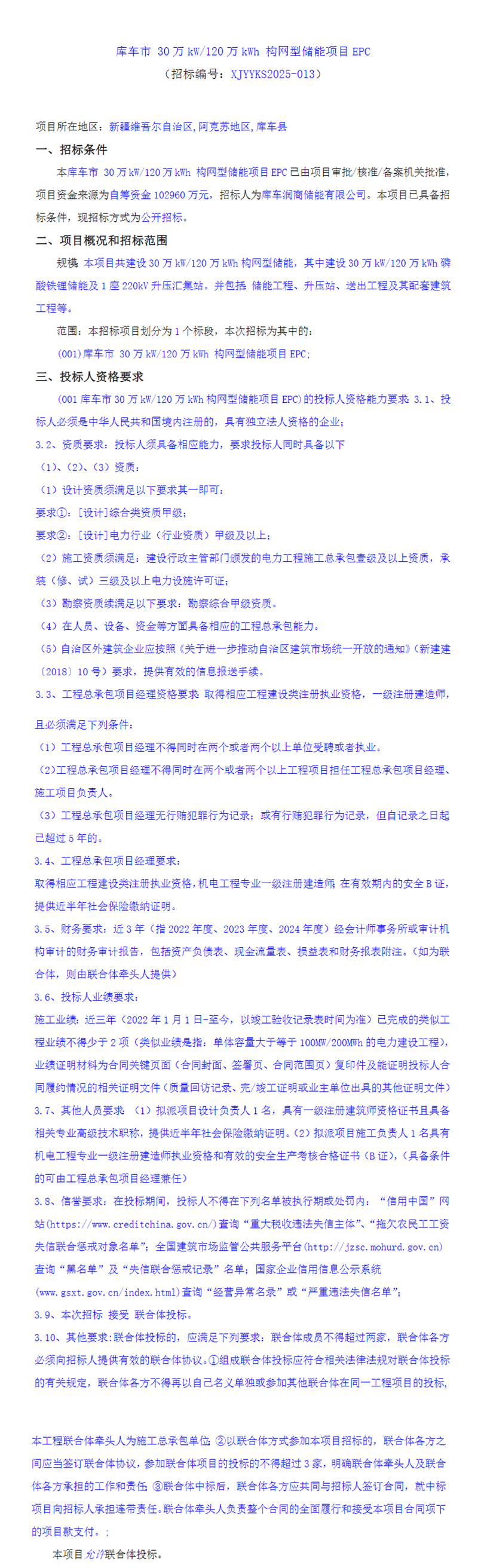 北极星储能网讯:2025年10月28日,库车润商储能有限公司发布300MW/1.2GWh构网型储能EPC招标,项目建设300MW/1.2GWh磷酸铁锂储能及1座220kV升压汇集站,并包括储能工程、升压站、送出工程及其配套建筑工程等。项目资金来源为自筹资金102960万元,合单价0.858元/Wh。